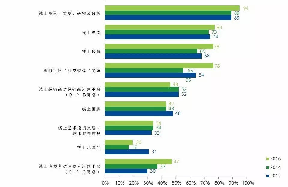 艺术资讯和教育领域被视为在线业务和科技影响较大的领域:82%的艺术从业者和收藏家认为新兴的线上公司真正的发展机遇在于资讯和教育领域。其中需要重点指出的是,收藏者及艺术从业者都强调增加透明度是艺术和金融市场运转良好的一个重要前提。