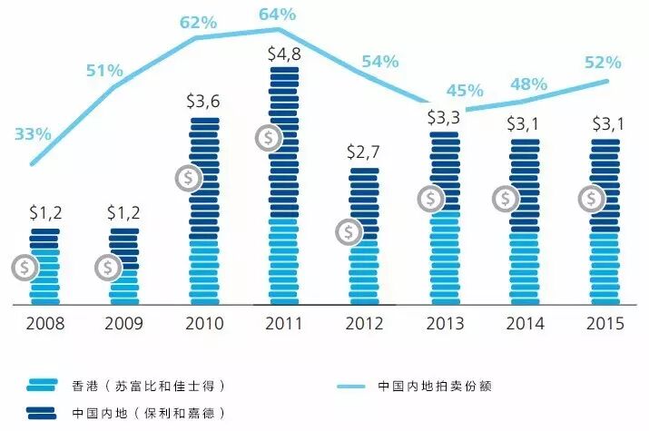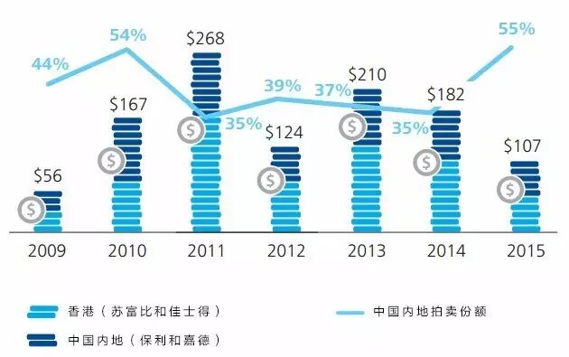 ▲ 佳士得与苏富比在2000至2015年间的拍卖交易总额(单位为百万美元),图表来源:ArtTactic