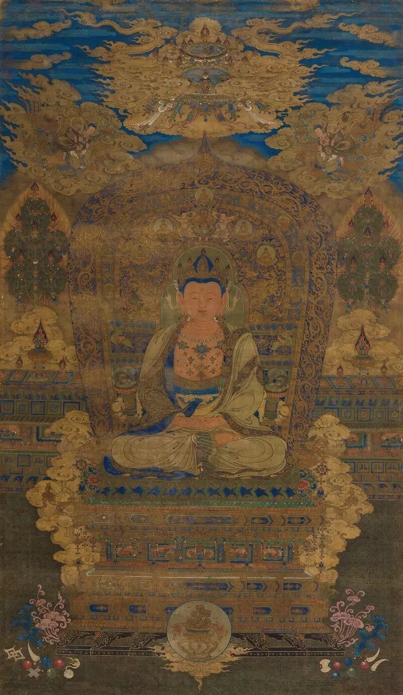 “元毗卢遮那佛”大佛像中,毘卢遮那佛结禅定印,全跏趺坐于金刚座上,神态安详,已入三昧之境。这件作品的风格、形制与台北故宫博物院所藏有乾隆题讃的《元毘卢遮那佛》如出一辙。且上钤乾隆五玺,可证此作应为清宫旧藏。