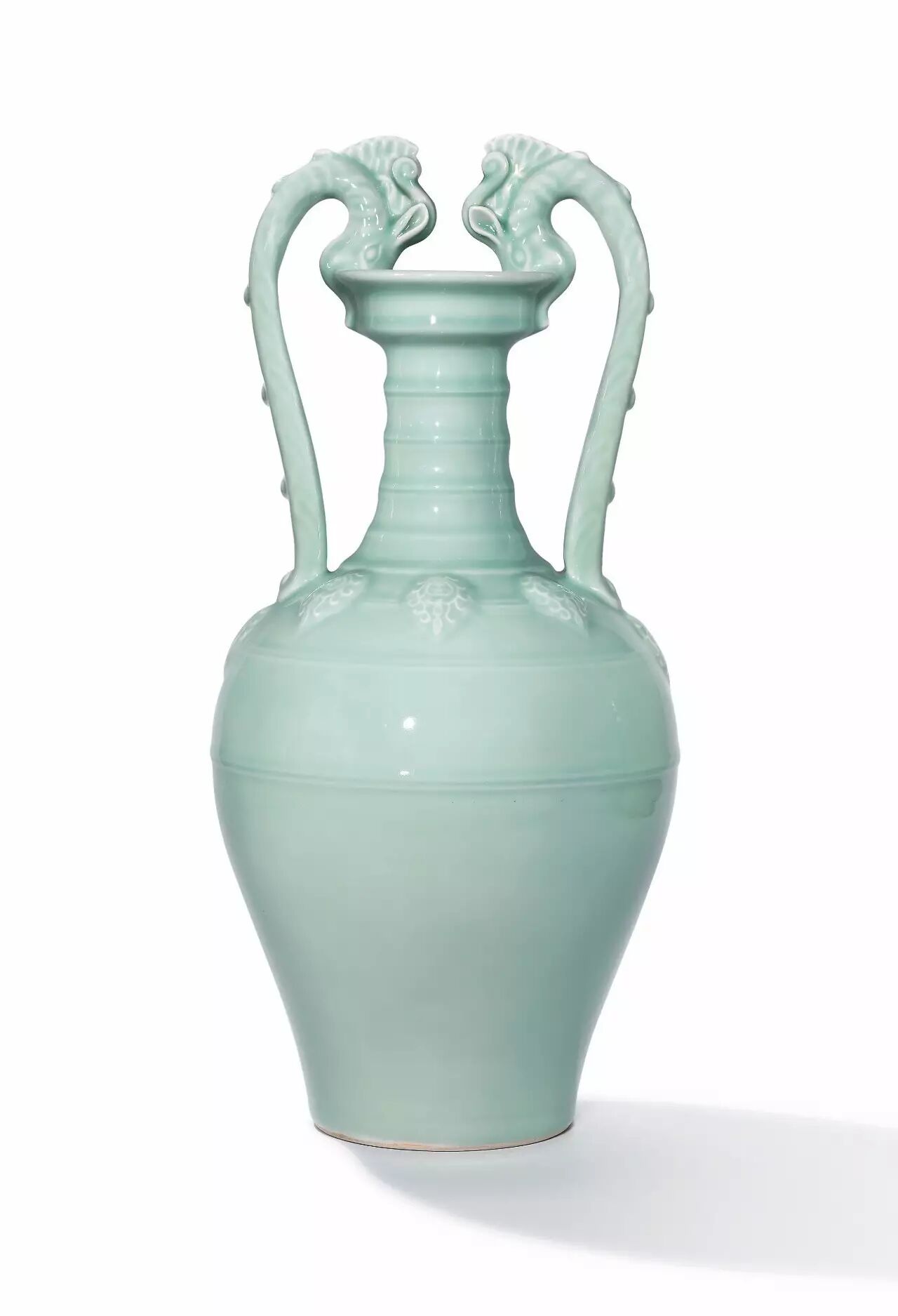 此件双龙尊的双龙柄配合竹节状颈及圆鼓腹为仿唐朝传瓶式样,青色釉面则仿照宋代龙泉青瓷。雍正年间烧制大型双龙尊的工艺难度较高,而传世的雍正粉清釉双龙尊只有四件,另外三件分别藏于沈阳故宫博物馆、美国克利夫兰艺术博物馆及加州陈氏典藏博物馆。此件双龙尊曾于2004年在佳士得以1742.37万港元(约合1543万元人民币)的价格成交,创下当时的清代单色釉瓷拍卖纪录。
