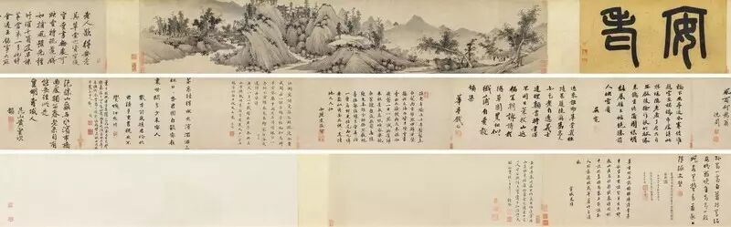 《安老亭图》中人是一姓孙的古稀老翁,从卷后的题咏看,应是一位安于平和的遁世高士,“安老亭”即是他栖隐之所。卷末有沉周自作七律一首,应为其50以后之作。引首为李应祯所书,应祯是名重一时的书家,对其女婿祝枝山影响极大。传世墨迹多书札,大字为仅见。拖尾有同时诸名士吴宽、钱福、都穆等诗题,其中张习、都穆、张灵等书迹存世极少,而朱存理是当时极有名的鉴赏家,题咏亦难得一见。此卷曾经清初鉴藏家朱之赤收藏,晚清入荣禄手,后归张伯驹、张群,是流传有绪的佳作。
