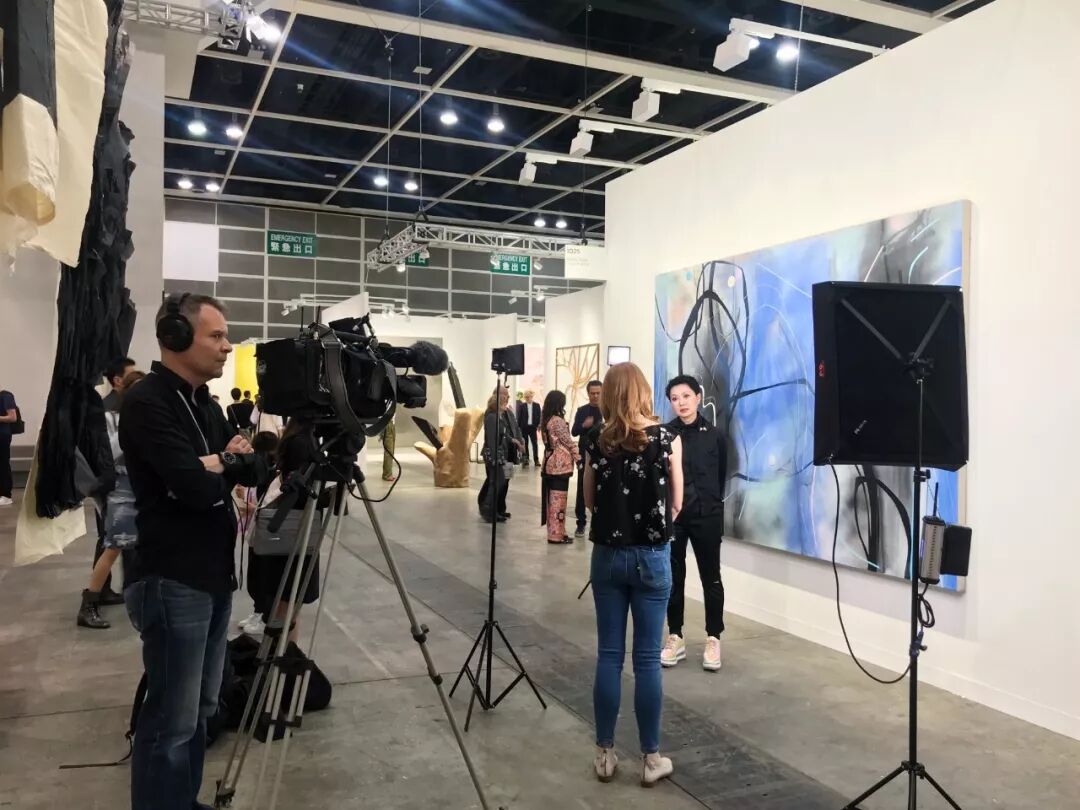 周力于香港巴塞尔艺术展的白立方展位接受媒体采访,图片来源:TANC