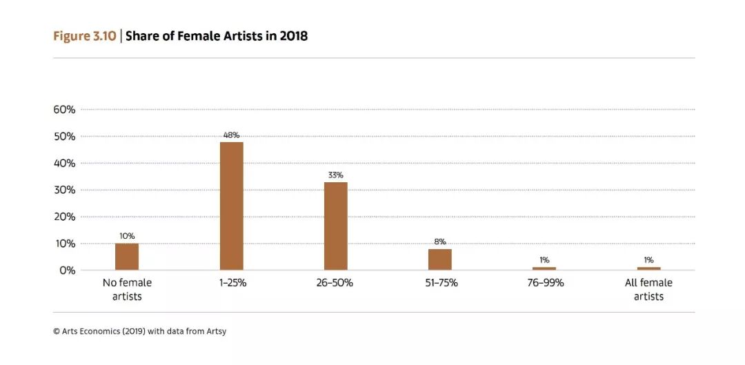 2018年女性艺术家在画廊代理的艺术家中所占比例,图片来源:Arts Economics