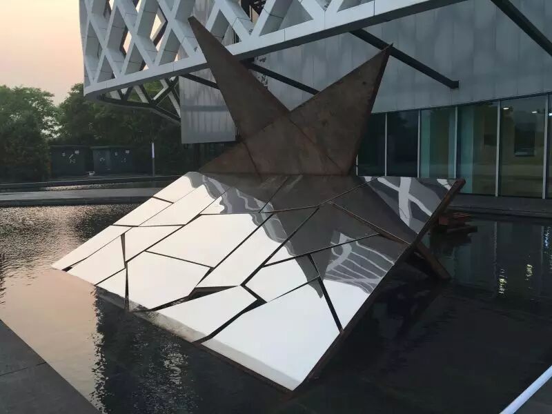 艺术家杨振中的新作《完美的几何形》(2016年)在某种程度上创造了一种视觉游戏,鼓励观者探索一个多维度的影像观看体验,他在美术馆入口处搭建的“纪念碑”式的装置,冷酷的金属质感给观众一种强烈的观感,把沉重的材料定向在无限的反射天空。