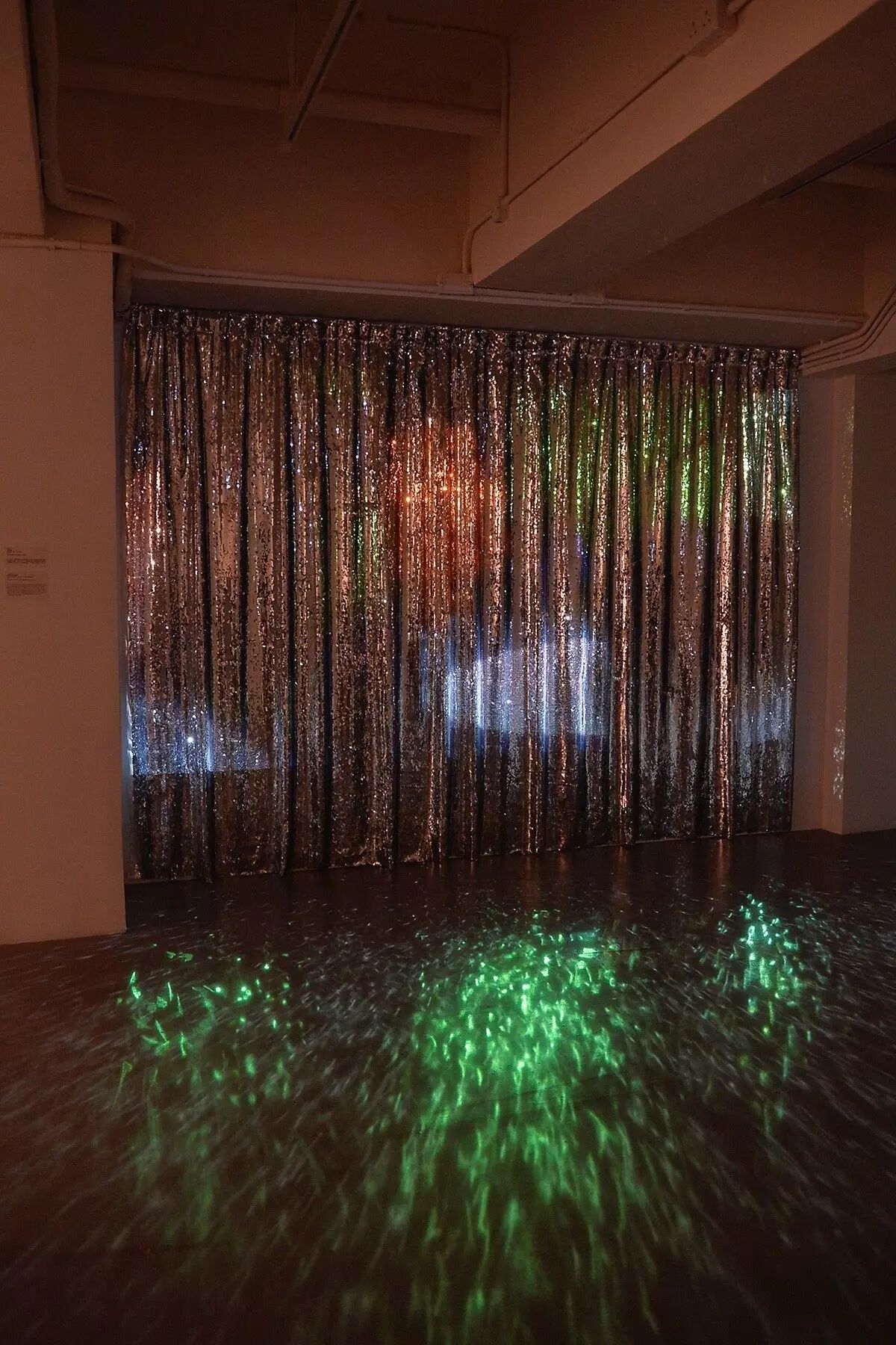 ▲ 李景湖《今日放映》视频静帧,录影装置、影片、亮片布面,尺寸可变,2014年,图片提供:艺术家与北京魔金石空间