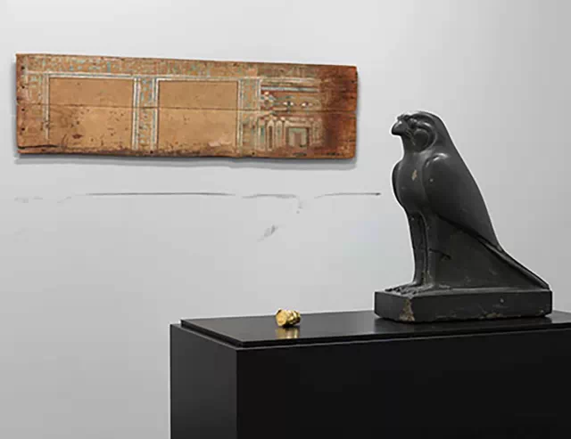 展览“重生之河”在古今艺术博物馆(MONA),马修·巴尼的铸青铜雕塑(右)与古埃及雕刻(左)并置,后面墙上为公元前1900至公元前1780年左右的古埃及棺木版画
