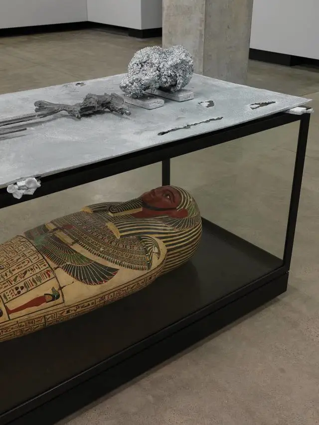 展览“重生之河”在古今艺术博物馆(MONA),马修·巴尼的金属雕塑作品被放置于馆藏古埃及石棺的玻璃橱窗上