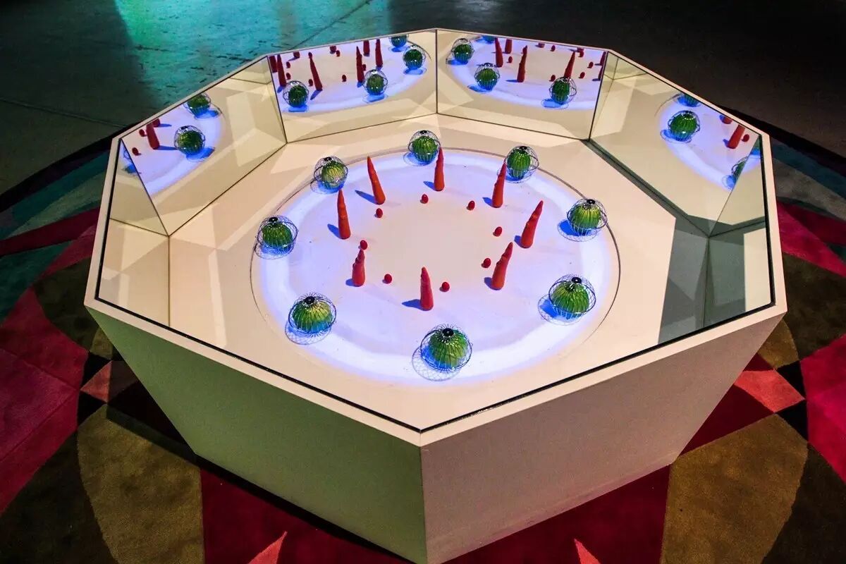 ▲ 王浩然,《梦境宇宙学》,2015,中密度纤维板,特富龙,不锈钢,磁石,地毯,机械组件,视频(7分30秒),4m×4m×2m;图片来源:由艺术家与OCAT深圳馆提供