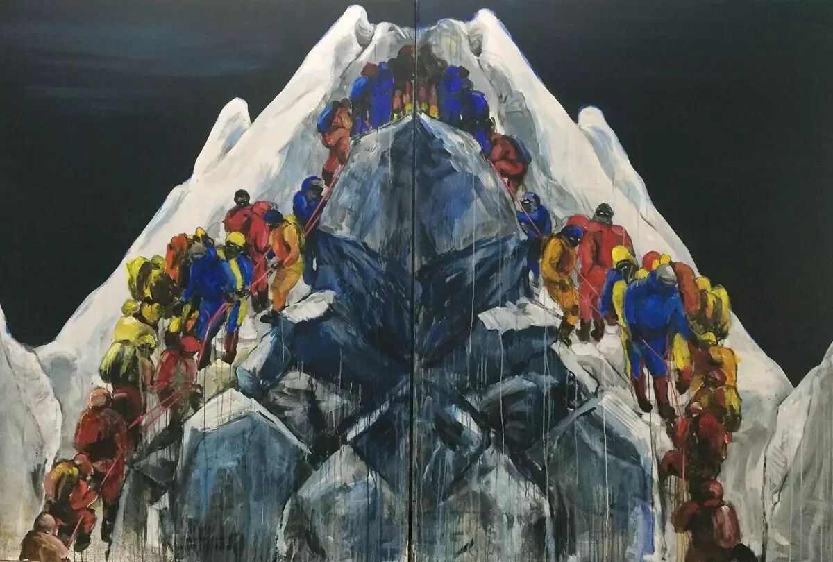 展览“万恶之首:金锋个展”缘于艺术家金锋此前与“珠峰”有关的项目,该展览亦是对“珠峰”的进一步挖掘,包含了美术馆4块坡道展厅近1000平方米的影像、绘画、装置作品。此外,艺术家金锋邀请策划人宋轶通过一场戏剧,共同对展场中的作品和艺术家本人进行“二次描绘”;策划人根据对艺术家创作思考的理解,在这个大型个展的内部(高12米、600平方米的核心筒展厅内)筹划、编导了一个与展览主题相关的独立表演项目。