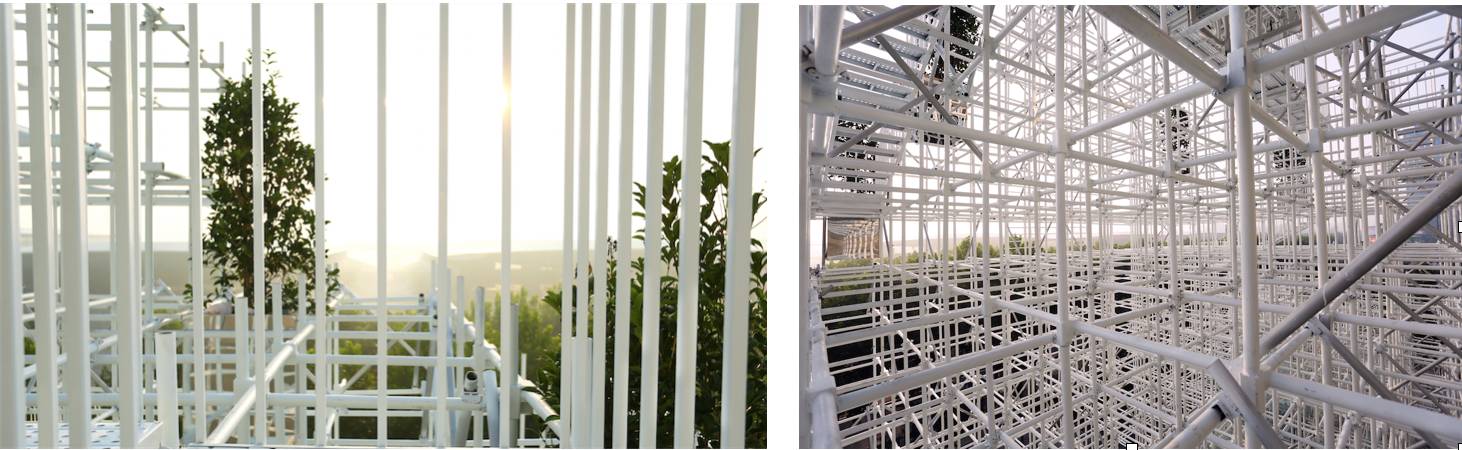 日本建筑师藤本壮介为“上海种子”特别设计的户外建筑空间“远景之丘”,一如既往地体现建筑师以极简方式在城市空间追求自然与人之间交融的愿景。“远景之丘”以纯白脚手架为建筑材料,完全以几何形状堆砌出一片类似山丘的景观。在脚手架冷感至极反而具有了某种亲和感之时,在白色钢筋水泥的空隙之中,葱郁的植被错落长出。“远景”/“愿景”的期许体现在荒凉与温暖、绝境与再生,人工与天然的对峙之中。