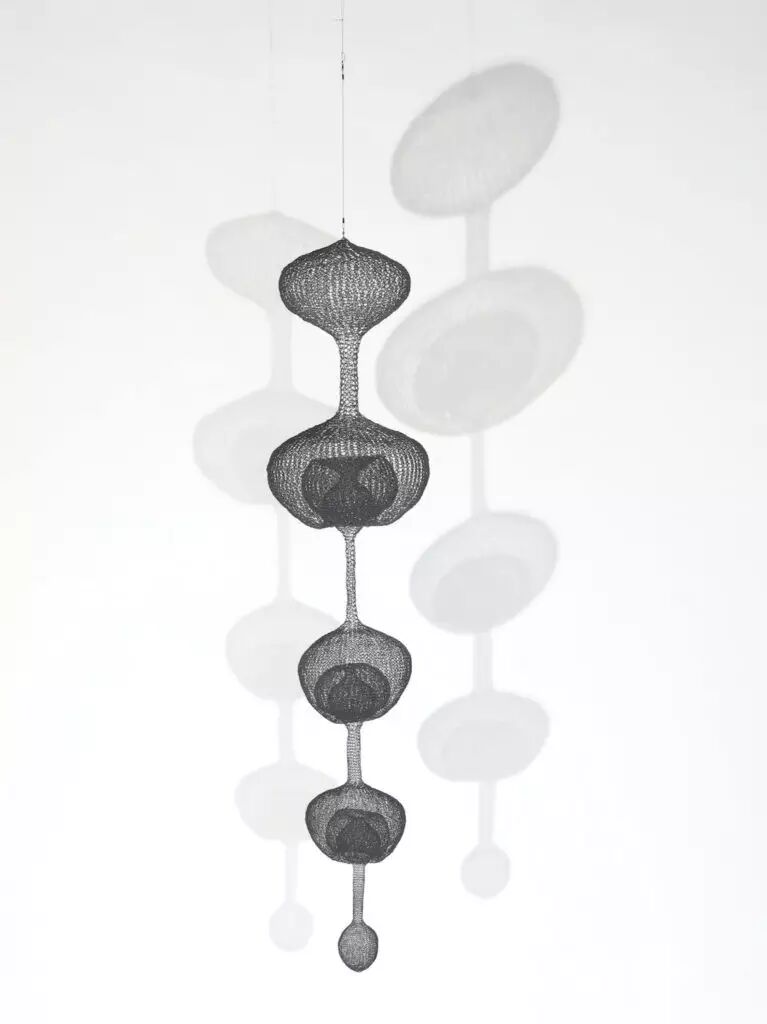 美籍日裔艺术家在Ruth Asawa的绳结线雕作品《Untitled, S. 080 》中,线雕像雪花或树木的自然形状,是用长铜丝、黄铜丝和铁丝手工编织而成。她在墨西哥旅行时学习编织技艺,创作出富有通透美感的雕塑作品悬挂在屋顶上或粘附到墙上,当观众漫步在这些作品周围时,可以发现光线、空间随视线变化的微妙维度。