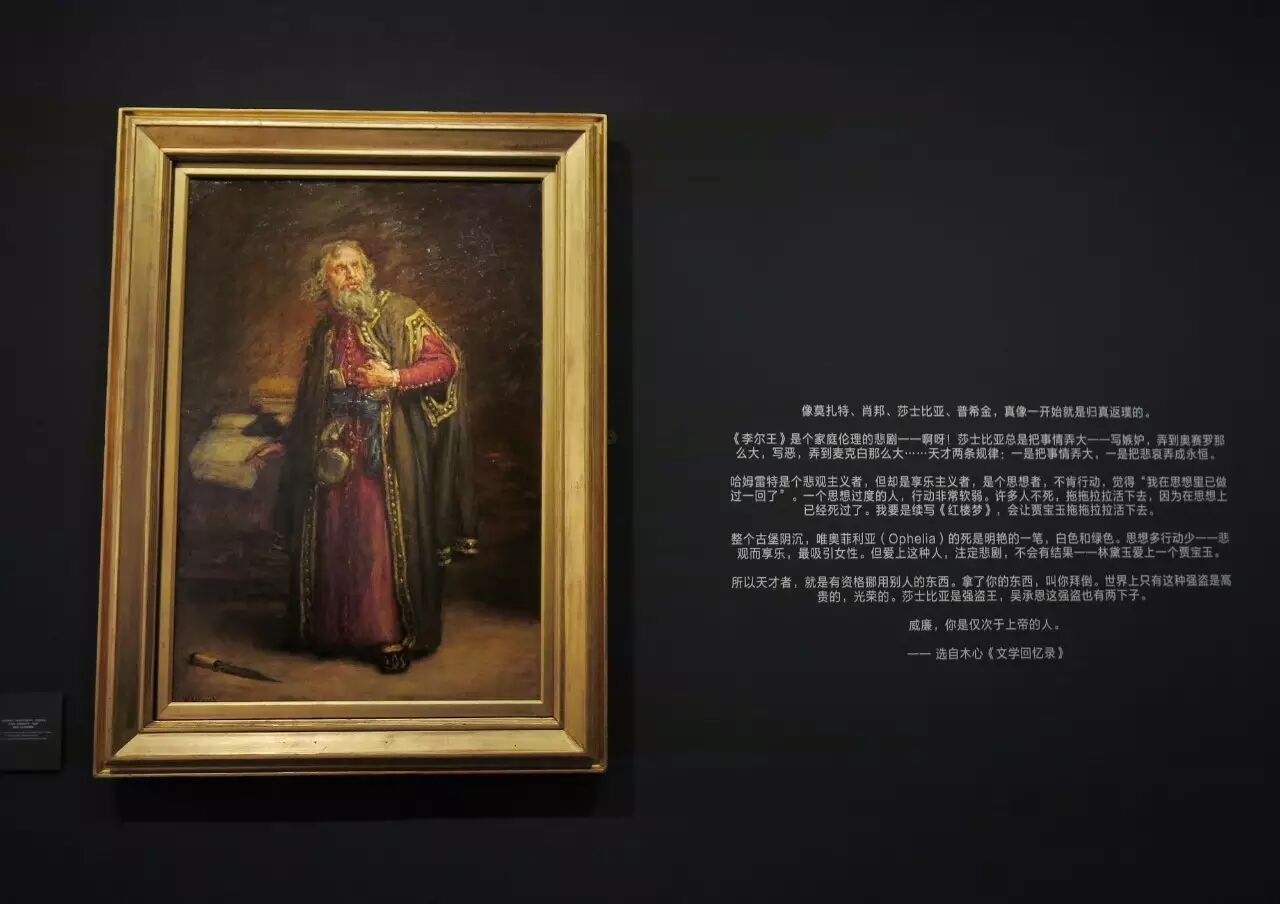 展览中两幅绘画展品是由英国皇家莎士比亚剧团所藏由英国画家沃特·乌威克(Walter Chamberlain Urwick)所作《威尼斯商人》夏洛克扮演者画像和遂昌汤显祖纪念馆藏品清代画家陈作霖所作《汤显祖小像》。莎士比亚与汤显祖作为对木心构成重要影响的人物,在两幅绘画作品旁,亦提有木心在《文学回忆录》中谈论两位戏剧大师的言语摘录。木心生前对莎士比亚十分推崇,他曾写道“威廉,是仅次于上帝的人。人间百态,莎士比亚退得开。退得最远最开的是上帝。”而对于汤显祖的评述,却充满着叹惋之情,“原本可以成为东方的莎士比亚,可惜没成。”