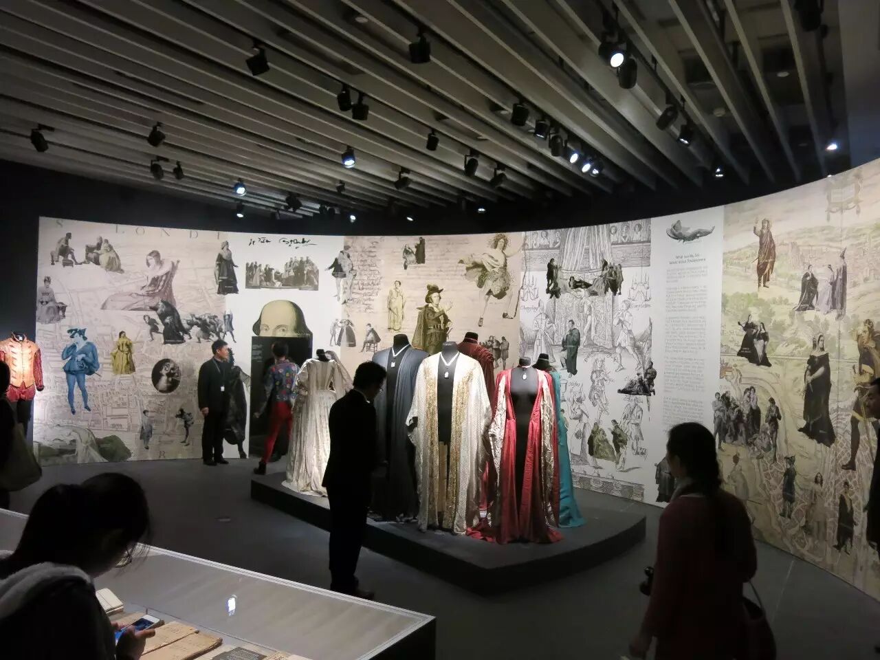 在展厅中,分别代表莎士比亚与汤显祖戏剧创作的环形看板与折页造型屏风立于两侧,构成两位东西方戏剧大师相互对照的主要结构。莎士比亚环形看板以古版地图、版画、文稿作为基调,其中的戏剧作品中的角色人物剪影,取自伦敦大英图书馆古董版莎士比亚戏剧集铜版画,来自18、19世纪的插画家描绘了前摄影时代扮演莎剧名角形象,惟妙惟肖,亦是莎士比亚文化遗产的一部分。在环形看板前方陈列8件由英国皇家莎士比亚剧团提供的古董戏服,分别由《奥赛罗》和《威尼斯商人》中的剧中人物穿着,曾展现于1953至1985年的伦敦舞台。