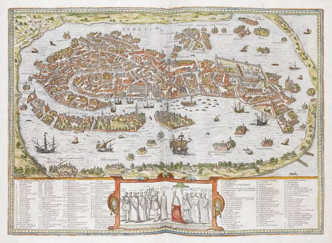 ▲ 16世纪⼿绘威尼斯的彩⾊地图。威尼斯是《威尼斯商⼈》和奥赛罗第⼀一幕的发⽣地。图片来源:大英图书馆