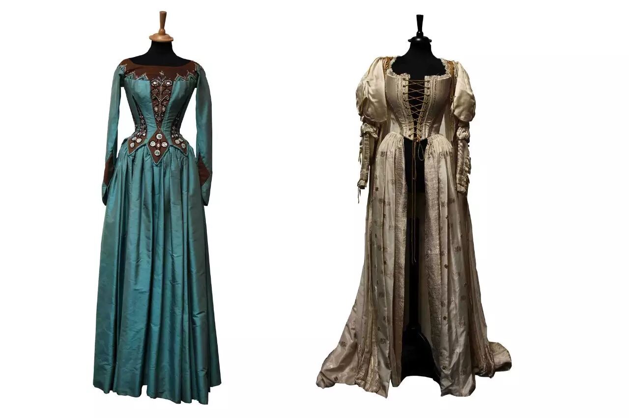 ▲ 蓝绿⾊丝绸裙,1987年由《威尼斯商⼈》中尼莉莎的扮演者乔西特·赛门( Josette Simon)穿着; 白⾊缎礼服,1985年由《奥赛罗》中黛丝德蒙娜的扮演者妮雅姆·库萨克(Niamh Cusack)穿着。图片来源:皇家莎⼠士比亚剧团
