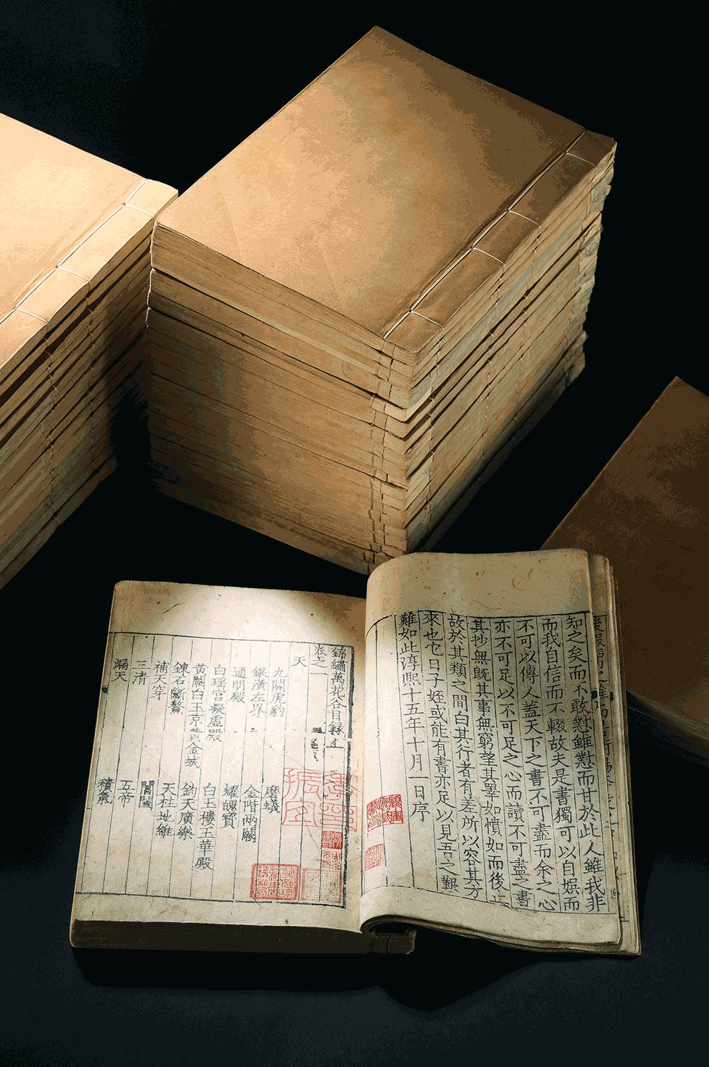 《锦绣万花谷》成书于南宋年间,是目前海内外部头最大的宋版书。这部类书包罗万象,对天文、地理、宗教、官制、内廷、器物、礼法、风俗、历史、诗文、音乐等门类均有详尽的描述,甚至不少失传古籍的所记载的内容在此书中都有保存。特展中的《锦绣万花谷》后集四十卷装订密实,纸张整洁,印刻精美,墨色清晰,历经800年后依然容光焕发,可以说是顾氏及历代诸贤藏书修为的集中体现。