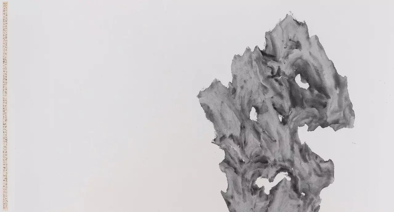 “花园”在不大的展厅内规划了同游园一般的展览动线。大幅的“遗石”系列作品错落放置于展厅的中心位置,三角形的墙面设置既起到了分割空间的作用,也使平面的“石头”在三维空间中获得了重量感。观者的视觉则可以在放置于展厅四角的《此处取决于偶然》和小山水册页《人生中最美好的事物总是免费的》处得到喘息,作品陈列颇具苏式园林一步一景的精巧之感,也与苏博花园中贝聿铭以平面呈现的假山石形成了呼应。