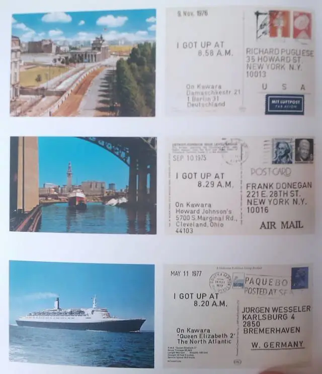 展览中的其他作品包括“我还活着”系列,是1970年河原温发给他朋友们的电报,以证明他的存在;“我起来了”系列则是写着他起床时间和他下榻地址的一系列盖章旅游明信片;“我去过”系列则是标有他走过的路线的城市地图。
