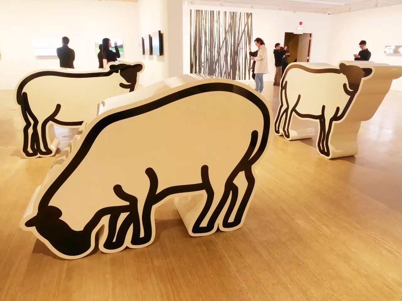 三楼展厅主要展出户外主题的作品。比起奥培标志性的人物肖像作品,这一系列相对陌生,与以人为主的作品形成鲜明反差。展览结构同样分为四个区域、一个中心点。数头黑脸白毛、萌态可掬的英国绵羊装置作品占据着中央醒目的位置,一番英国田园风情呈现眼前。