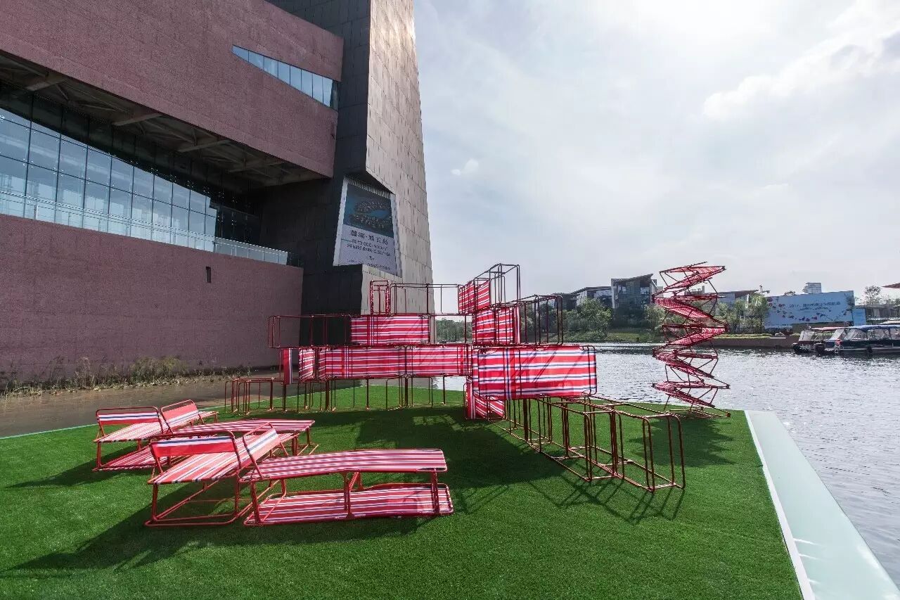 在半环绕美术馆建筑的湖中,香港艺术家李民伟的10米x10米的作品《开展所能 X》漂浮在水面上。装置使用的尼龙折床作为密集居住环境下催生的都市化产物,在此模糊了私人空间与公共空间的边界,也提供对于个人与社群关系的解读方式。