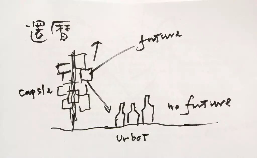 ▲ 伊东丰雄在接受《艺术新闻》专访时通过手绘解释新陈代谢派没落的未来以及 URBOT 成立的初衷,即对未来悲观的想象