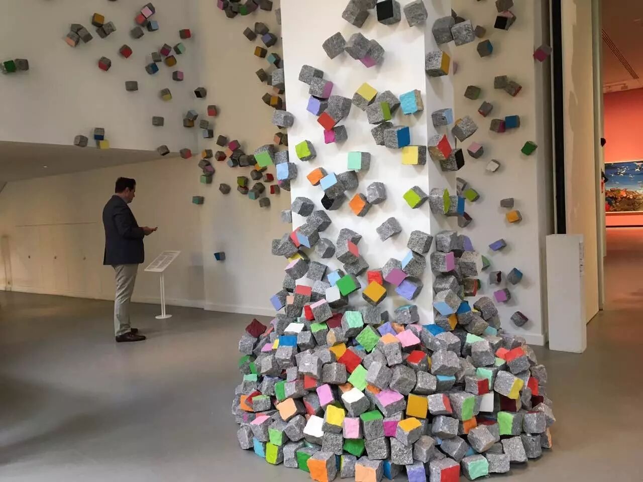 对此,路易威登基金会在征得皮高齐和马宁昂同意下,邀请常住比利时的喀麦隆艺术家巴斯卡·马汀·塔尤(Pascale Marthine Tayou)在展厅入口处构思制作大型装置,不论是涂上红、黄、蓝、黑、白等各种颜色的小石块在柱子和墙面蔓延开来《殖民》或是将非洲53个国家的国旗彼此相连的《独立恰恰》,艺术家希望传达的是一种混合、相遇、宽容、和平共处的人文精神。