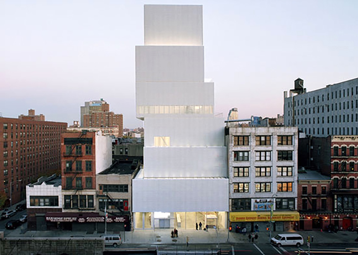 新美术馆是玛西娅· 塔克(Marcia Tucker)于1977年在惠特尼博物馆(Whitney Museum of American Art)担任绘画和雕刻作品馆馆长时,在对一场展览极端的批评后,而建立起来对当代艺术具有时代意义的新美术馆。30多年后的今天,新美术馆已经成为当代艺术家或艺术团体的首选舞台,新美术馆在早期发掘了很多目前当红的艺术家,如:基斯·哈林(Keith Haring)、杰夫·昆斯(Jeff Koons)、理查德·普林斯(Richard Prince)等。2007年,位于纽约Bowery Street的新馆开幕,该馆由创建于上世纪90年代的SANAA小组(妹岛和世+西泽立卫)设计,这两位倡导新风格建筑的建筑师这次的设计让内部空间穿透到外部,使得空间面积达60000平方公尺,是原来的2倍。整栋大楼里面包含有媒体中心,书店,讲堂,教室,咖啡馆等。