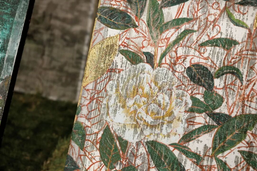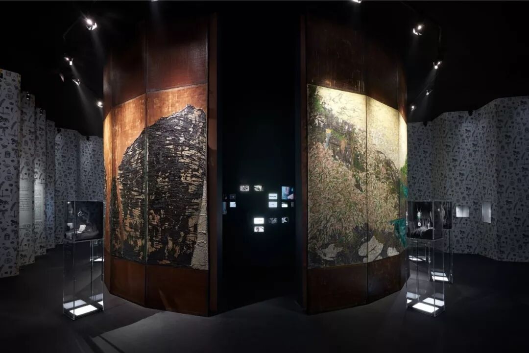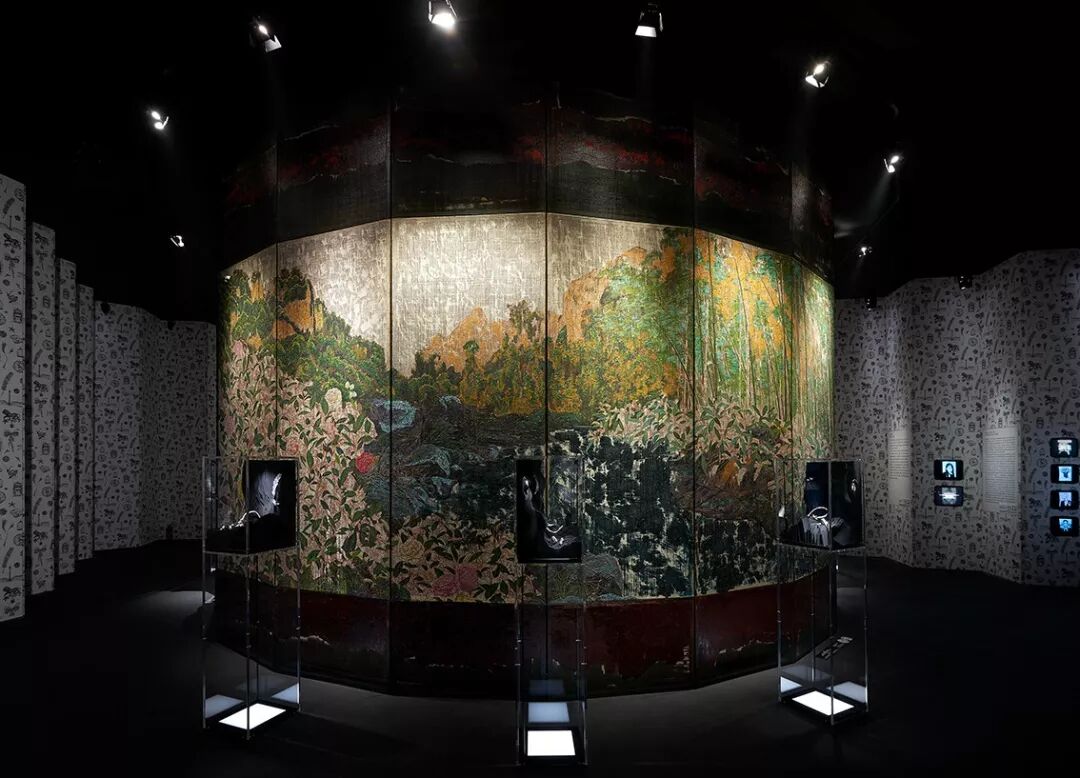 展厅内巨大的漆面屏风为艺术家吴观真所作。吴观真重新解读了香奈儿挚爱的乌木漆面屏风,创作了三件分别名为《高山图》、《早春图》和《愉园图》的漆面屏风作品。作品灵感来源于艺术家儿时的记忆——阳光在斑驳的树影间跳动、嬉戏,作品呈现出大漆轻盈而半透明的质感,融入写意的风格,在色彩之间留下了大片飞白,展现出多层次的东方意象。