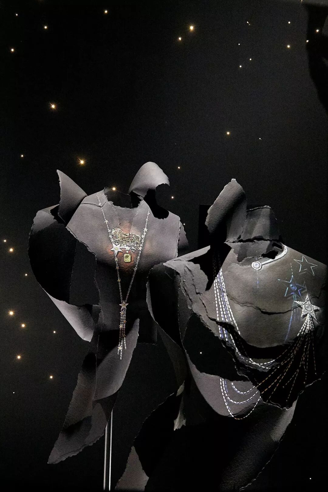 在展厅中这间标记为“18”的房间里,呈现了以香奈儿“Bijoux de Diamants”钻石珠宝系列为原型的复刻版臻品珠宝。配合艺术家吴观真创作的漆面屏风,珠宝的陈列呈现出高山流水的态势。观者能够感受到香奈儿女士在珠宝设计中最为钟爱的五种主题元素:星星、太阳、流苏、羽毛与蝴蝶结。香奈儿开创性地以自由、多变而随性的风格来诠释奢华的高级珠宝作品。为了呈现出轻盈而纤美的构造,她的作品中几乎看不到任何搭扣或钻石镶嵌托座,而可随性拆卸的设计,也为这些首饰提供了自由多变的佩戴方式。