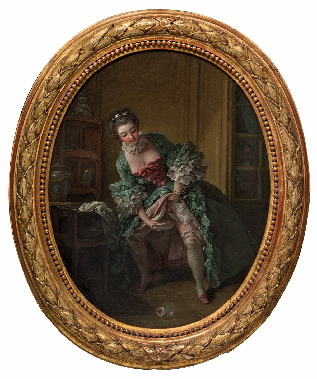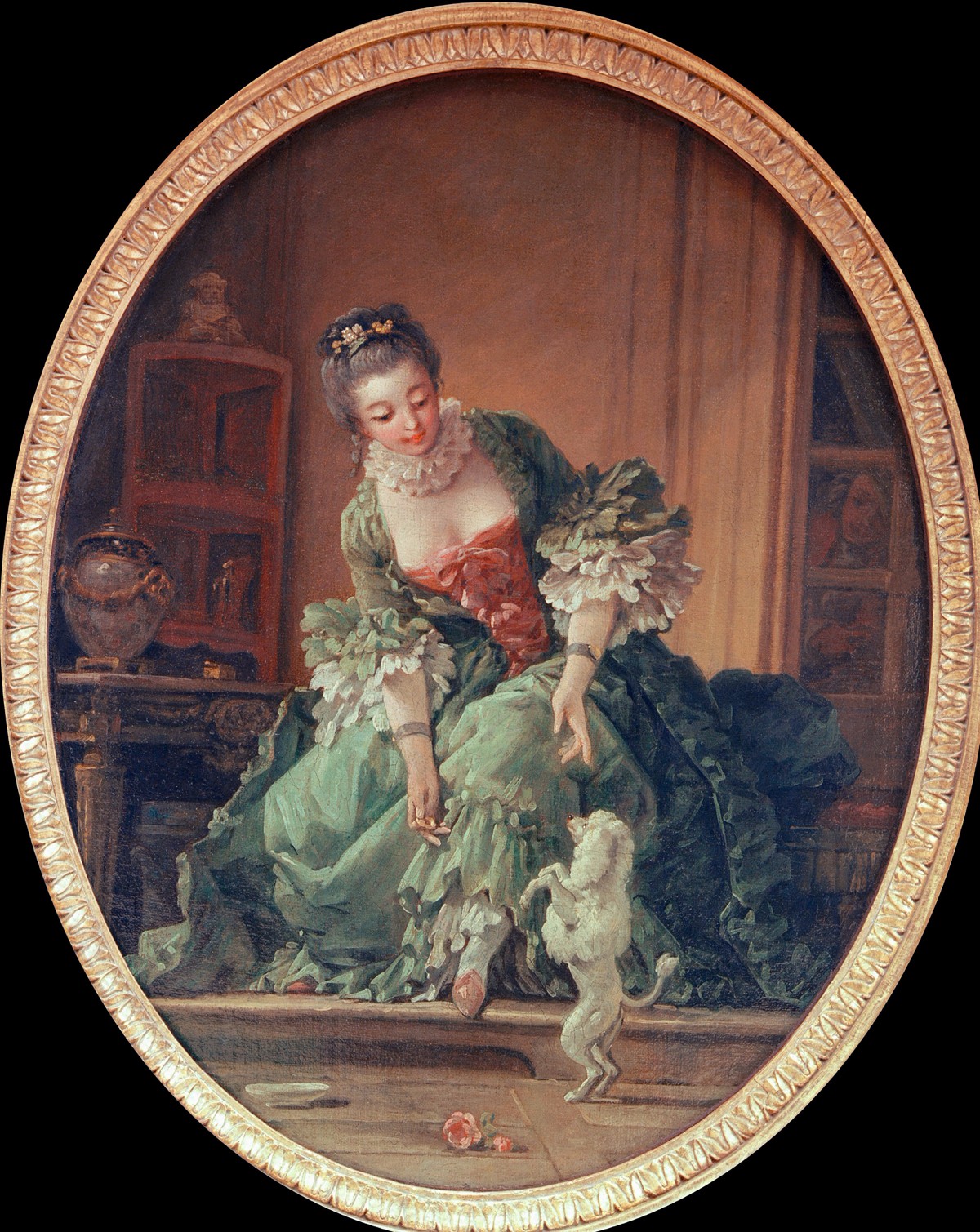 弗朗索瓦·布歇的这套18世纪的作品采用了 “遮掩”与“窥探”两两对应的主题表现形式,第一幅的女子衣着华贵,姿态优雅,正在逗弄小狗;而相对地,在第二幅中原本与小狗玩耍的女子则半蹲着,一手掀开衣裙