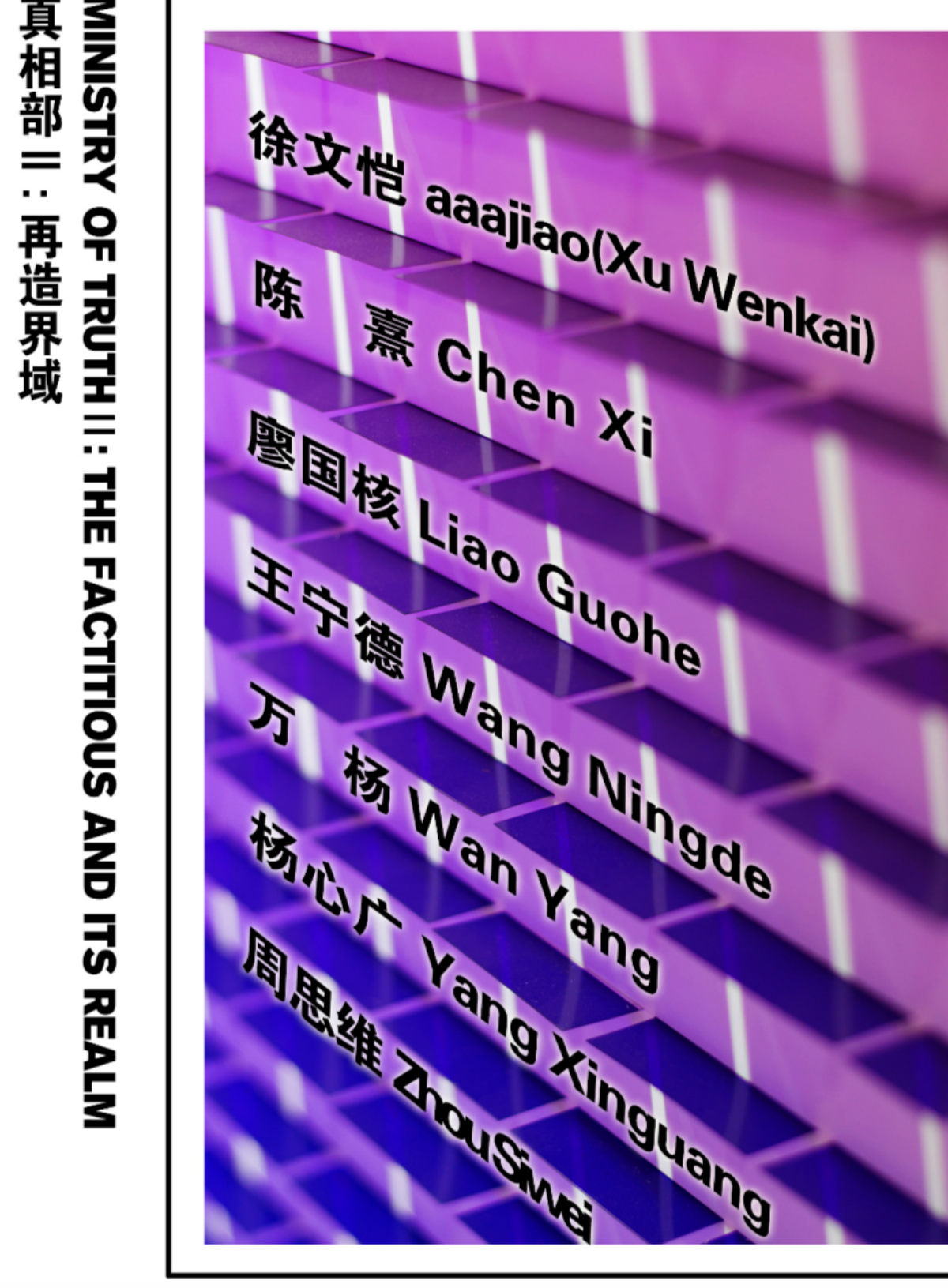 “真相部 II:再造界域”参展艺术家为 aaajiao (徐文恺)、陈熹、廖国核、万杨、王宁德、杨心广以及周思维。第一期的“真相部”致力于呈现艺术家在自我 创作实践中有关政治命题的研究,而此次展览旨在展现艺术家创作实践中基于再造现实的研究,通过质感、表 层与空间关系等基本且直观的表象在绘画、摄影与媒体艺术等创作媒介中的探索。