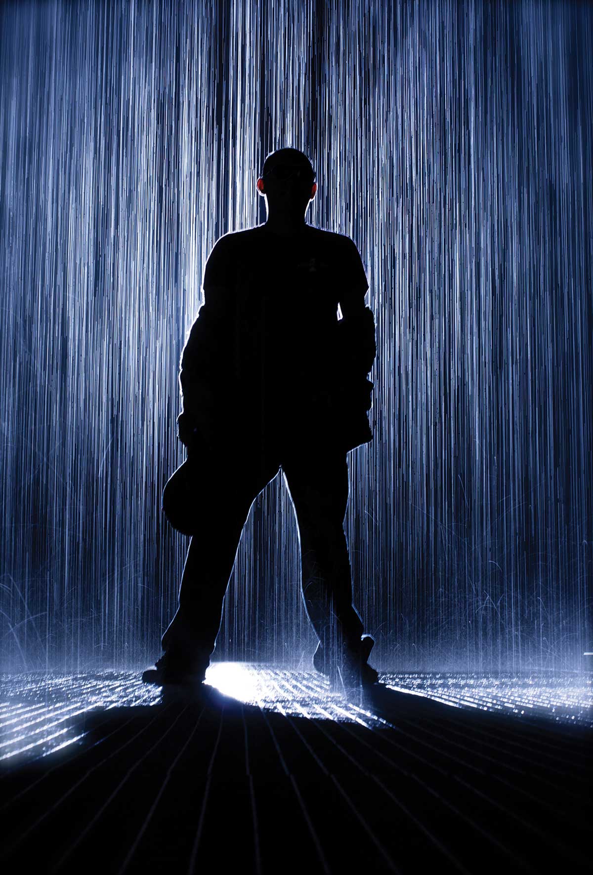 2013年,在纽约最消磨时间的事情当数排队参观现代艺术博物馆(MoMA)最受追捧的展览“雨屋”(Rain Room,2013年5月12日至28日)。这件安装在一个空旷房间里的装置作品是由伦敦的艺术家组合“随机国际”(Random International)创作的。在这个黑暗的房间里,水像下雨一样从天花板上洒下来,装备的感应器会实时监测人的移动,并且随之关闭水流。