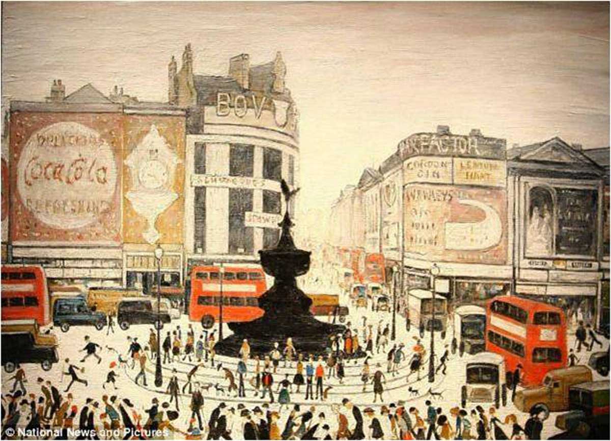 创作于1960年的《皮卡迪利广场》(Piccadilly Circus)的内容是伦敦的地标建筑皮卡迪利环形广场。人们可以看到伦敦特色的红色双层巴士和黑色出租车,还有急匆匆来往的游客、工人围绕在黑色的沙夫茨伯里纪念碑以及基督教博爱天使雕像的周围