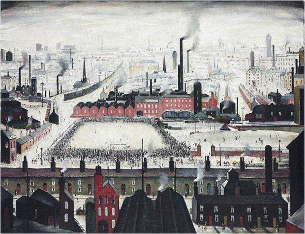 这幅《足球比赛》(The Football Match) 创作于1949年,展现了林立的厂房间空地上,上百个典型的洛瑞式“火柴人”围在白雪皑皑的广场四周,观看一场足球赛的场景,是洛瑞作品中少见的以足球为主题的作品