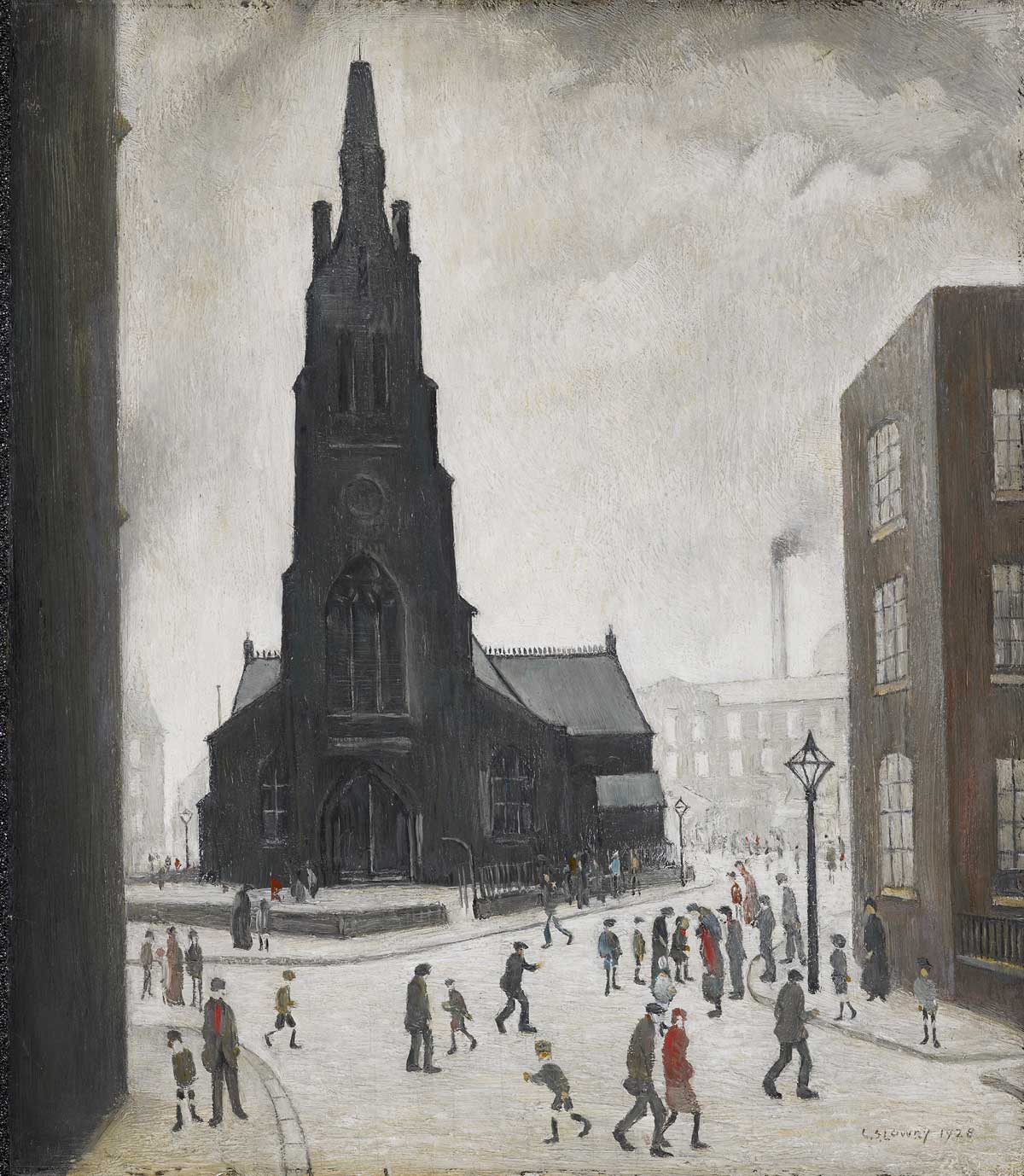 L.S.洛瑞,《街景,圣西蒙教堂》,(A Street Scene, St Simon’s Church),1928年