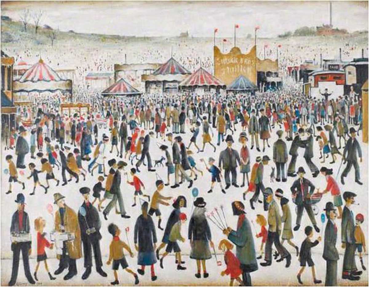 《雏菊角公园的耶稣受难节》(Good Friday, Daisy Nook)创作于1946年,描绘了了二战后曼彻斯特雏菊角公园里,从一年一度的市集归来时心情愉悦的游人们
