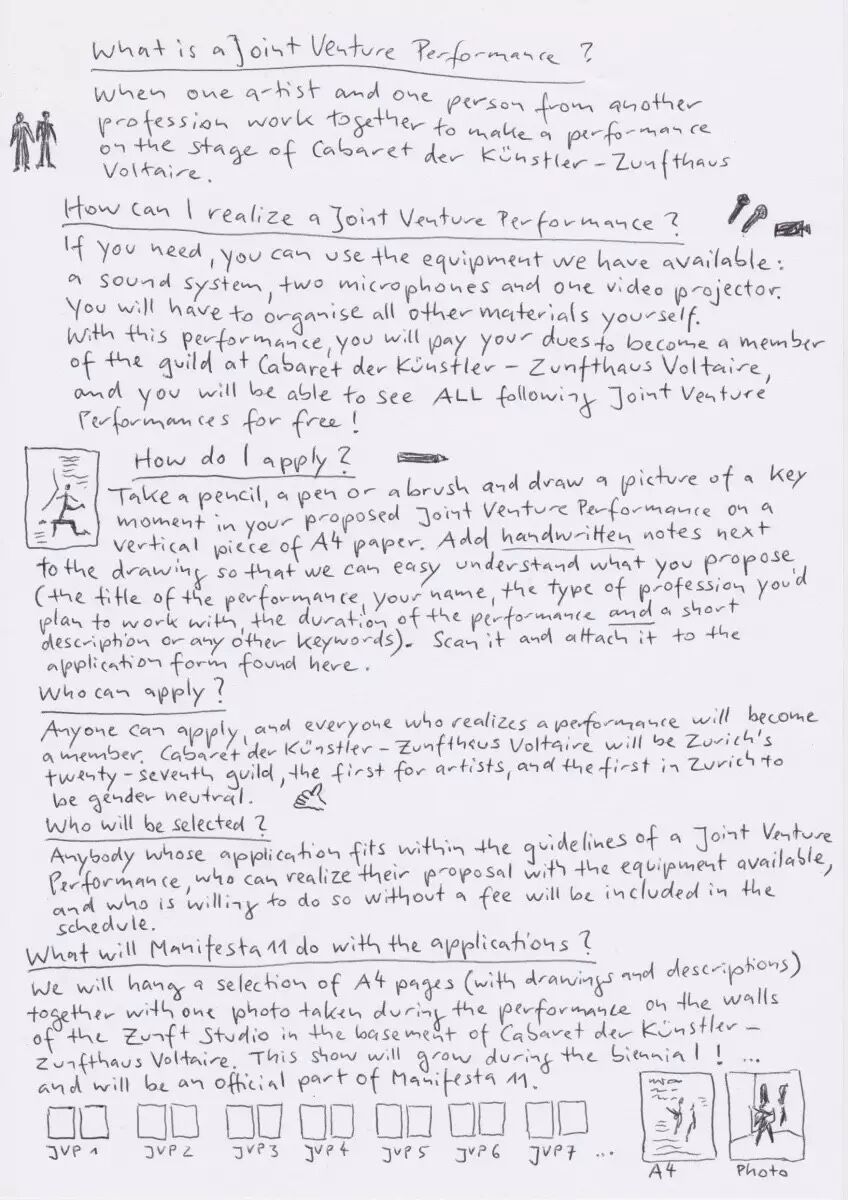 新成立的“伏尔泰行会馆”将行使沟通联合艺术工作者的职能:艺术工作者向行会提交其跨行业合作项目的构想,即可成为行会成员,并获取展示作品的空间。古老的手工业联合形式、达达主义艺术家群体发生与陈列的中心场所、宣言展中艺术与不同工作的对话沟通——多重语义重叠下的伏尔泰酒馆,模糊又拓宽了艺术工作的形式与边界。