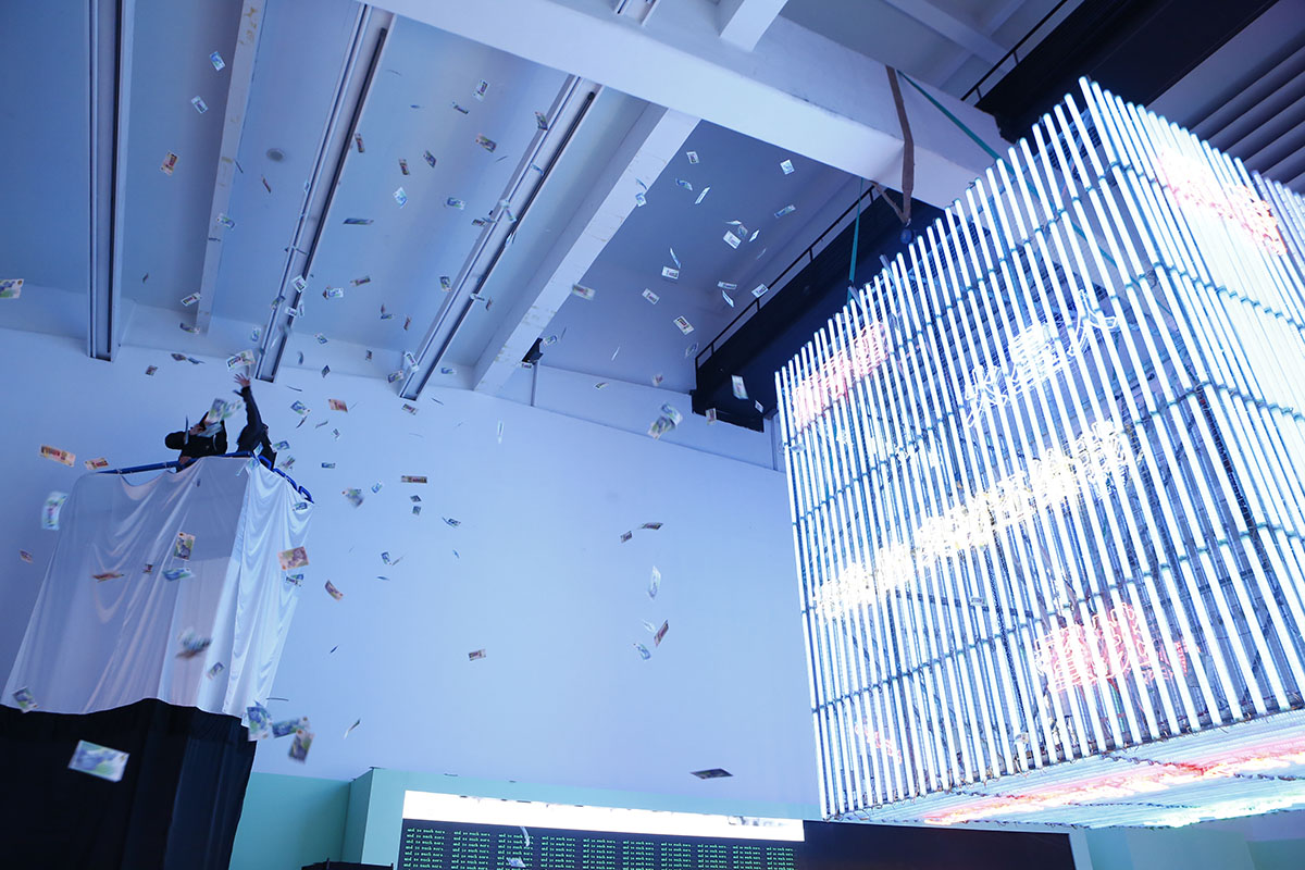 “明天的派对”开幕现场,双飞艺术中心从高处向地面大把撒着面值为0的“双飞币”