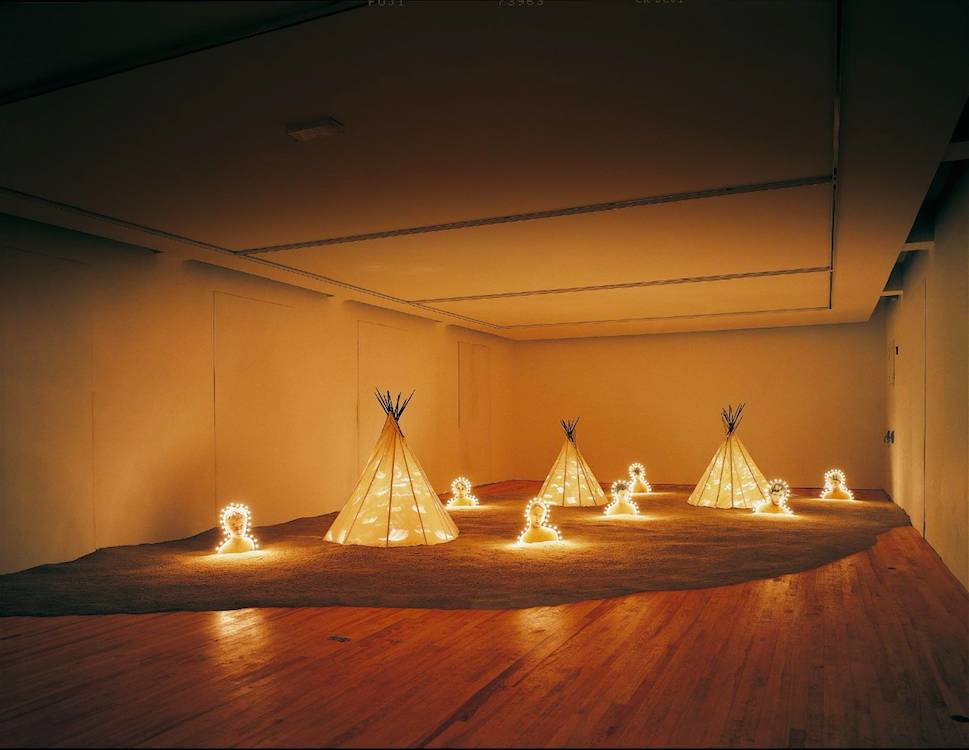 1984年,勒维克创作了《夜》(La Nuit),这是另一件他的早期代表作:铺满沙子的展厅中竖立了大小不一的几顶帐篷,温暖的灯光从中透出,成为幽暗展场的唯一光源。沙地上还竖立着几个不同的男孩肖像,环绕四周的小灯泡将肖像点亮。这件作品以艺术家对自己童年的思绪为轮廓,呈现出某种孤独与隔绝,而在这些作品中反复出现的灯泡也在勒维克之后的创作中演变为对霓虹灯的使用。