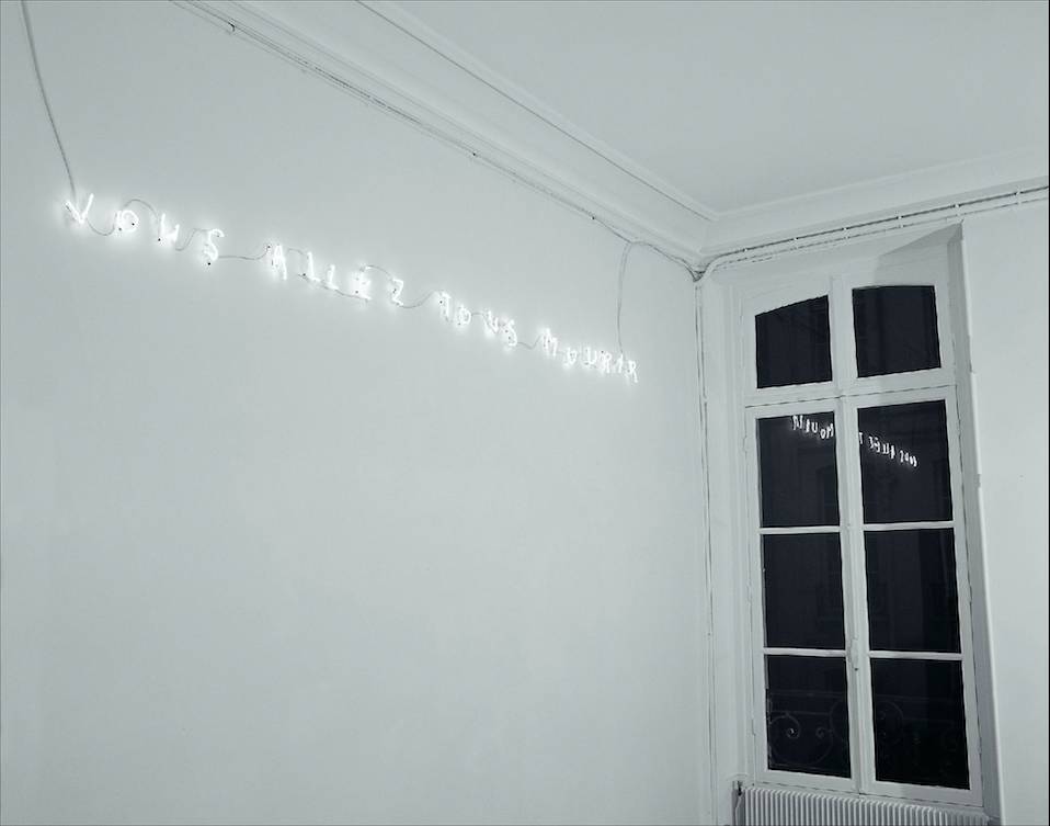 与霓虹灯所象征的城市商业文化之间形成某种对比的是带有强烈个人色彩的手写字体,这一选择更直接来源于艺术家的个人情感。“我的霓虹灯书写都是委托别人来做的。第一个长时间帮我书写的人是我的母亲。在生命最后的日子里,疾病使她渐渐丧失了视力。她的字原本很漂亮,书写得也很专心,慢慢地开始变得颤抖,带着迟疑,直到变得几乎不能辨认,这引起了我的兴趣。书写的脆弱改变或增加了我选择的普通语句的意思。这些发光的符号要传递的信息因此变得模糊而不确定。”勒维克在接受《艺术新闻》专访时说道。以这种最具有辨识度的方式,勒维克“书写”着《生活真美好》(La Vie Est Belle,1999)《我是一堆屎》(Je Suis Une Merde, 2001)《你们都会死》(Vous Allez Tous Mourir, 2001)等作品。
