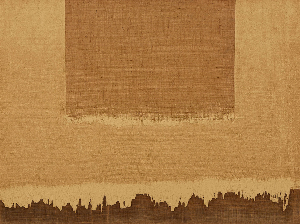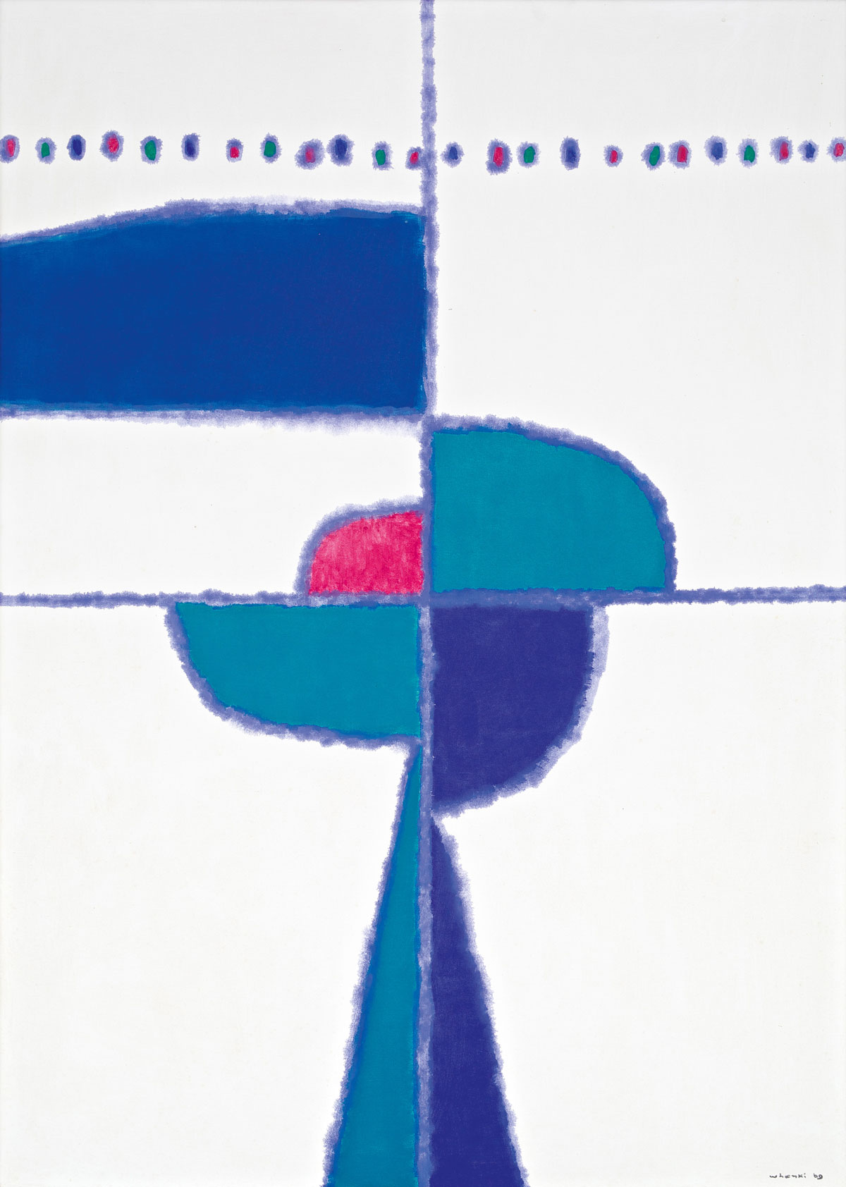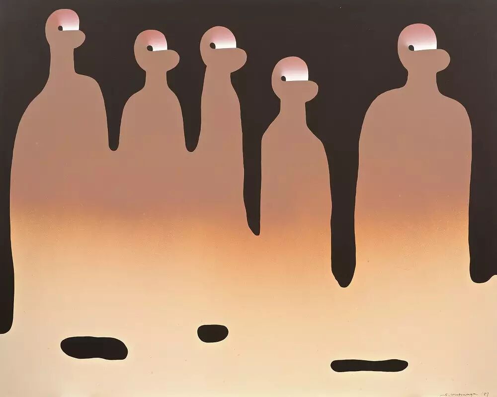 香港苏富比当代亚洲艺术部主管林家如谈到以具体派与单色画这两个关键词勾勒出展览框架的初衷:“亚洲和国际收藏族群往往只能通过线性叙事去了解这两个群体,而我们希望突破地缘关系,通过一个平行对照的‘面’,来介绍这两个活跃时期相近的艺术群体。” 日本的战败导致了该国战后对本国文化的批判及重新认识,随着日本逐渐恢复其于国际政治与经济格局中的地位,欧美的文化艺术思潮也迅速传入日本。战后的日本艺术面临着两个议题:一方面艺术家们拒绝再与战争时期的旧体制合作;另一方面,他们也渴求日本作为独立国家的自主性,这又意味着拒斥对欧美艺术的盲目景仰。 《Tsunagatteiru》,元永定正,1987年-1988年 《作品》,前川强,1963年年