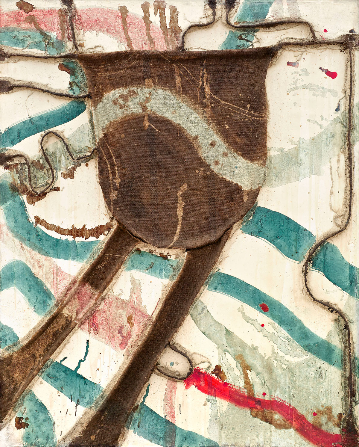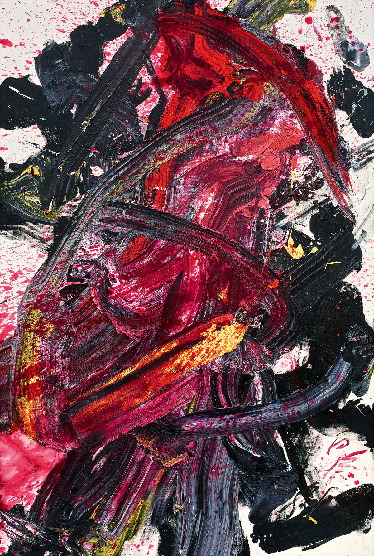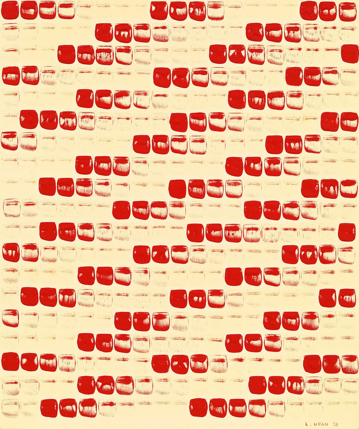 香港苏富比当代亚洲艺术部主管林家如谈到以具体派与单色画这两个关键词勾勒出展览框架的初衷:“亚洲和国际收藏族群往往只能通过线性叙事去了解这两个群体,而我们希望突破地缘关系,通过一个平行对照的‘面’,来介绍这两个活跃时期相近的艺术群体。” 日本的战败导致了该国战后对本国文化的批判及重新认识,随着日本逐渐恢复其于国际政治与经济格局中的地位,欧美的文化艺术思潮也迅速传入日本。战后的日本艺术面临着两个议题:一方面艺术家们拒绝再与战争时期的旧体制合作;另一方面,他们也渴求日本作为独立国家的自主性,这又意味着拒斥对欧美艺术的盲目景仰。 《Tsunagatteiru》,元永定正,1987年-1988年 《作品》,前川强,1963年年