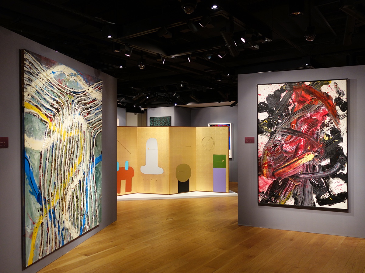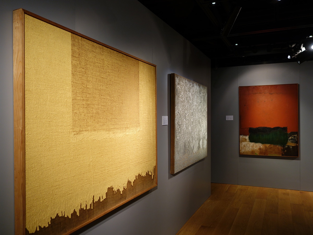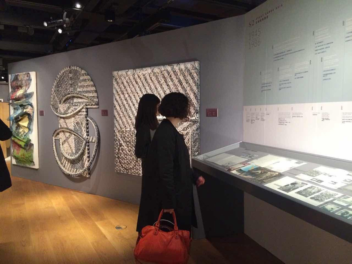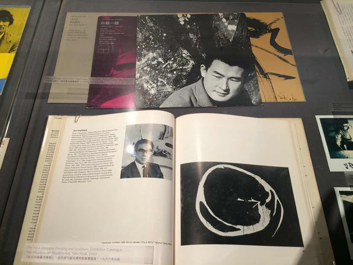 展览“亚洲前卫艺术——具体派传奇”现场,前川强的《作品》(1999年,左),元永定正的《无题》(四联屏风,1988年,中),白发一雄的《Onkurodanau Unjaku》(1994年,右) 第二次世界大战是亚洲现代发展史中的一个重要分水岭,对于位处东亚的日本与韩国来说,两国的政治、经济、文化环境都因战争而发生了深刻的变革。近年来,几个备受瞩目的博物馆级别展览都将目光重新集中于这两国的战后前卫艺术—比如2011年日本“物派”与韩国单色画代表人物李禹焕在纽约古根海姆博物馆的回顾展“记录无限”、2012年于纽约现代艺术博物馆展出的“东京1955-1970:新前卫”,以及2013年纽约古根海姆博物馆的“具体派:灿烂乐园”等等。