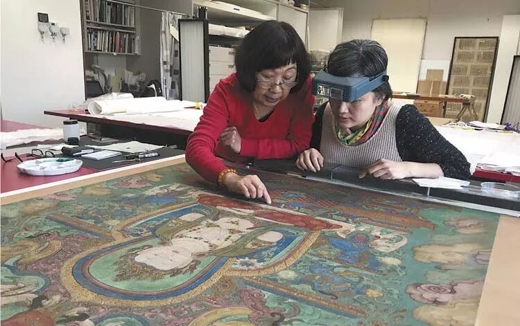 上海博物馆专家诸品芳(左)与克利夫兰艺术博物馆的萧依霞正在处理唐卡。(摄影/巫伊婷),图片来源:clevelandart.org
