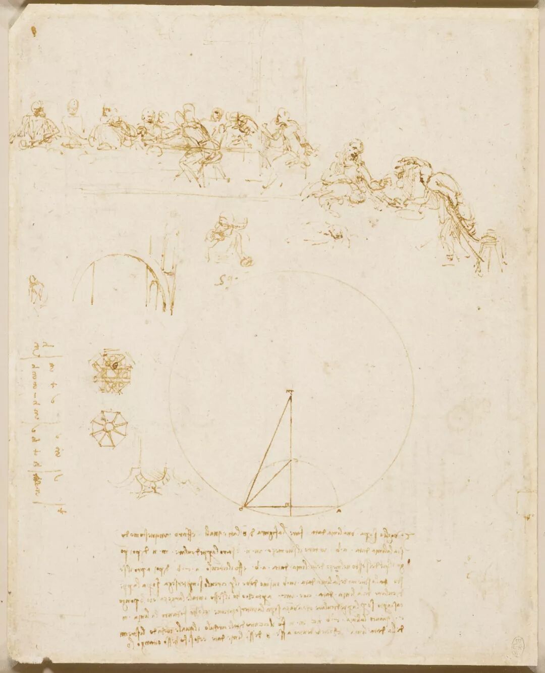 《最后的晚餐》堪称是达芬奇最伟大的作品,作品是受卢多维克·斯福尔扎(Ludovico Sforza)之托为恩宠圣母教堂(Santa Maria delle Grazie in Milan)的食堂所绘制。这次展出的手稿中有唯一一份和《最后的晚餐》创作相关的手稿,在手稿的左上方表现的可能是坐着的十个人物,其中可能有犹大。手稿右侧是达芬奇对画面中部的设计,犹大站起身取走基督手中的面包,圣约翰趴睡在桌上。手稿下部有达芬奇对于弧形和八边形的研究,对于这些几何图形的研究可能是在绘画创作中考虑建筑形制的影响。