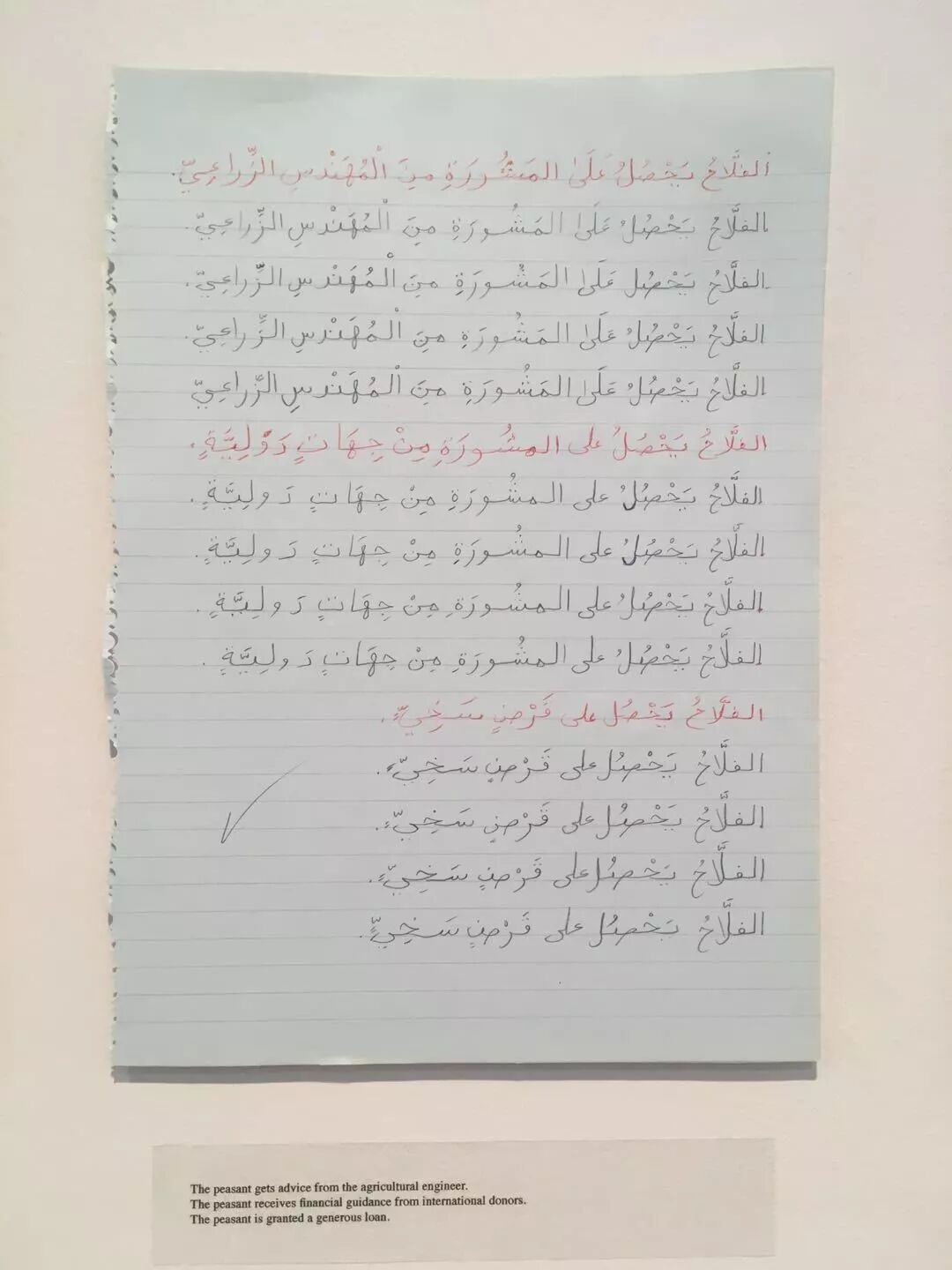 展览中的作品几乎使用手工制作、机械组装、影像、装置、纺织等各类形式来反映食品系统危机和政治隐喻。展览中印象最为深刻的是一件名为EL FELLAH ANDO FES 的作品,由25张划有蓝线的练习本纸在墙面一字排开,上面是手抄的诗句和红色圆珠笔批改打勾的痕迹,诗句通过类似语文造句的形式勾勒了一段农民形象的革变过程。