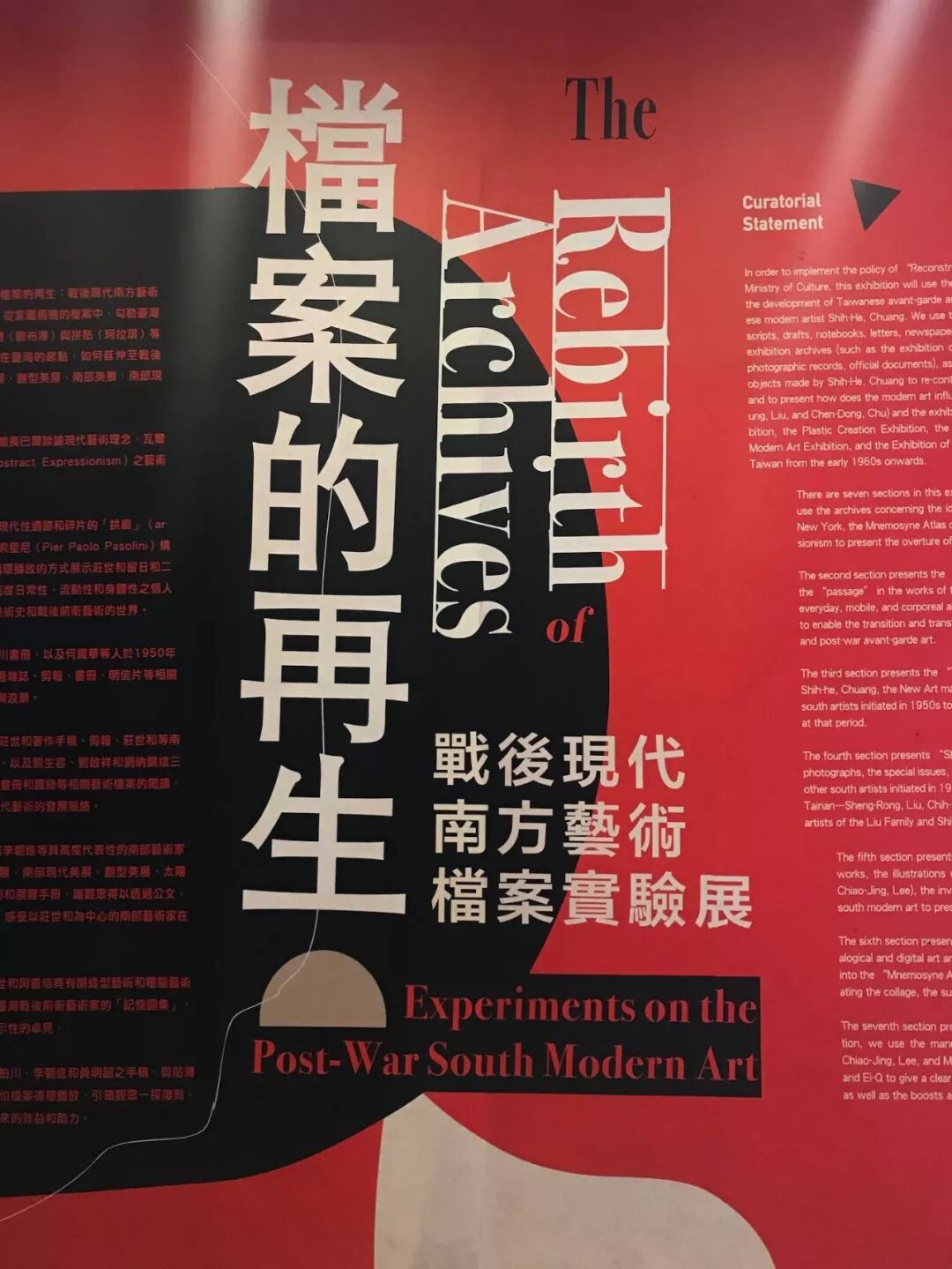 以“台湾艺术档案中心”的发起为契机,负责人、艺术史家蒋伯欣在台南艺术大学策划的“档案的再生”展,以聚焦战后台湾的现代艺术的发展史为背景,前面考掘日本殖民时期之现代艺术之前因的铺陈,延续至战后随着冷战政治形塑下现代艺术行自由民主之文化潮涌下的结果,进而推论和追问艺术史写作之于台湾的区域演进中,东亚历史与政治的变异及其复杂勾连的内在“主体的”精神症结。
