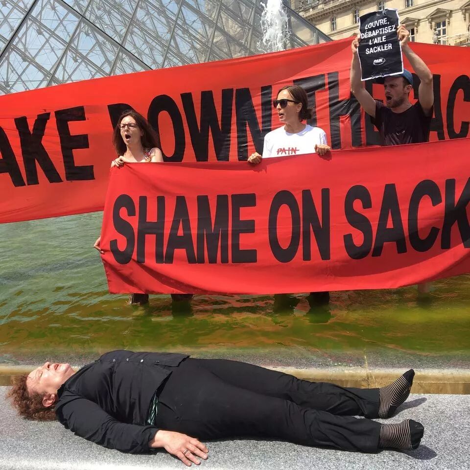 7月初,曾受止疼药奥施康定(OxyContin)成瘾困扰的美国摄影艺术家和活动家南·戈尔丁(Nan Goldin)和她创立的行动组织PAIN(Prescription Addiction Intervention Now)与巴黎本地活动家一起,手持红色横幅,涉入法国巴黎卢浮宫金字塔的喷泉。横幅上写着他们的诉求:“撤下赛克勒的名字”。(take down the Sackler name)