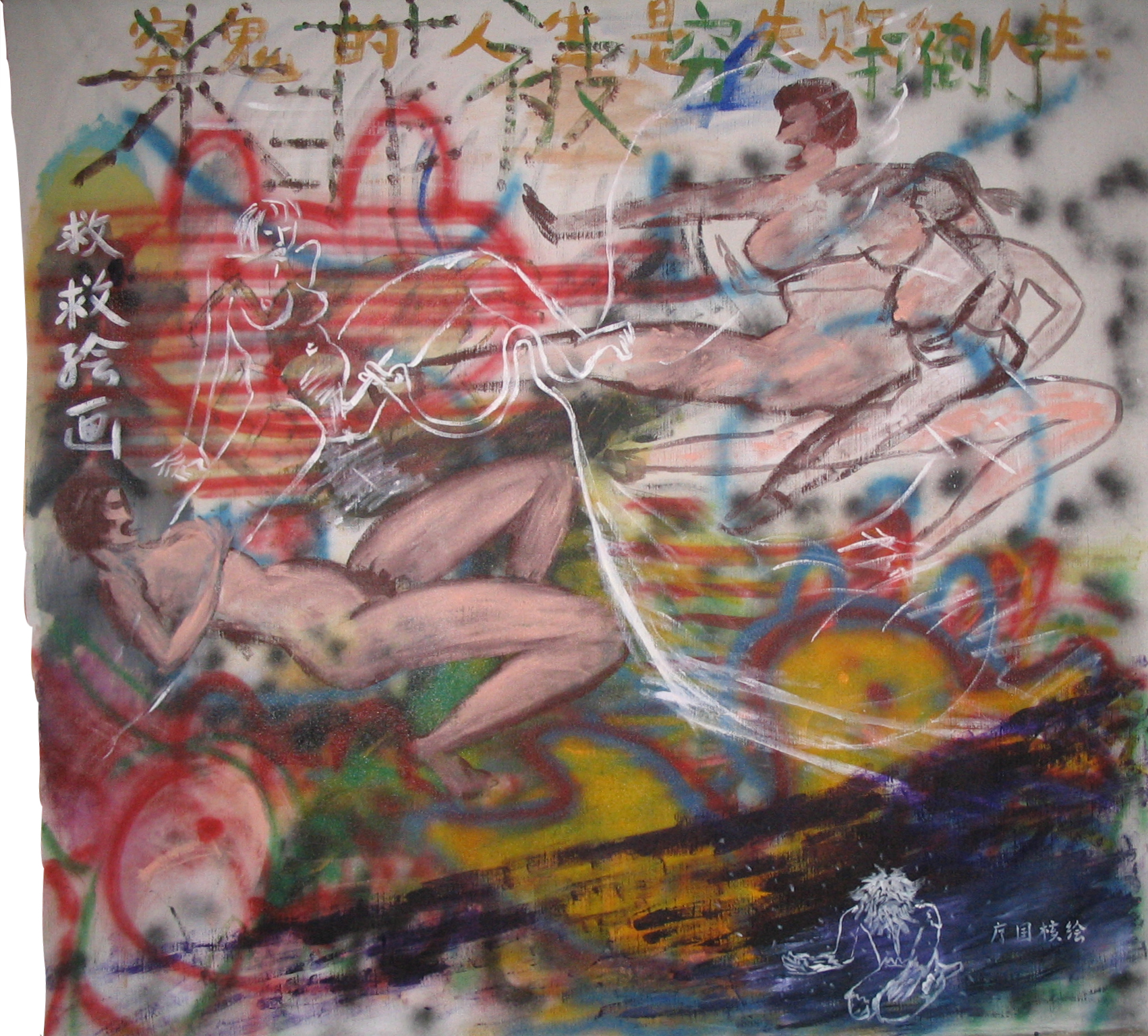 正在四方当代美术馆展出的廖国核绘画作品,《救救绘画(米菲被穷人打倒了)》,2009年