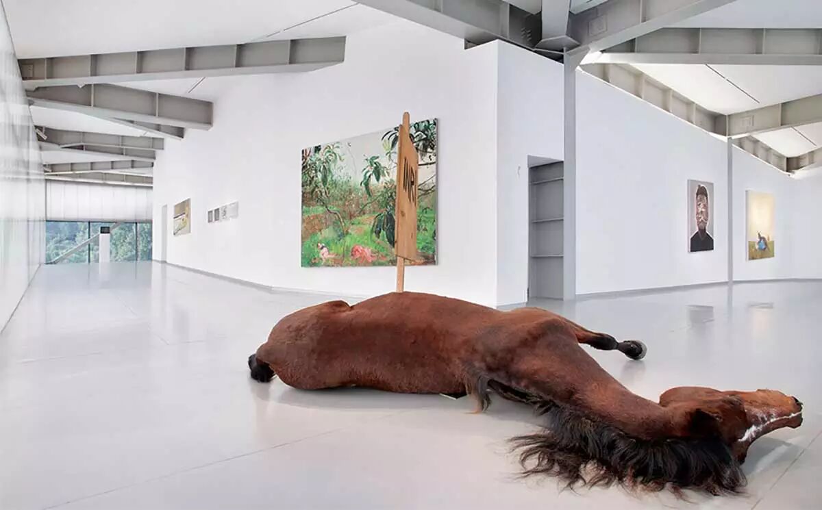 南京四方当代美术馆开幕展“歧异花园” 展览现场。前:莫瑞吉奥·卡特兰《无题》,后: 段建宇《咱们村里的年轻人》